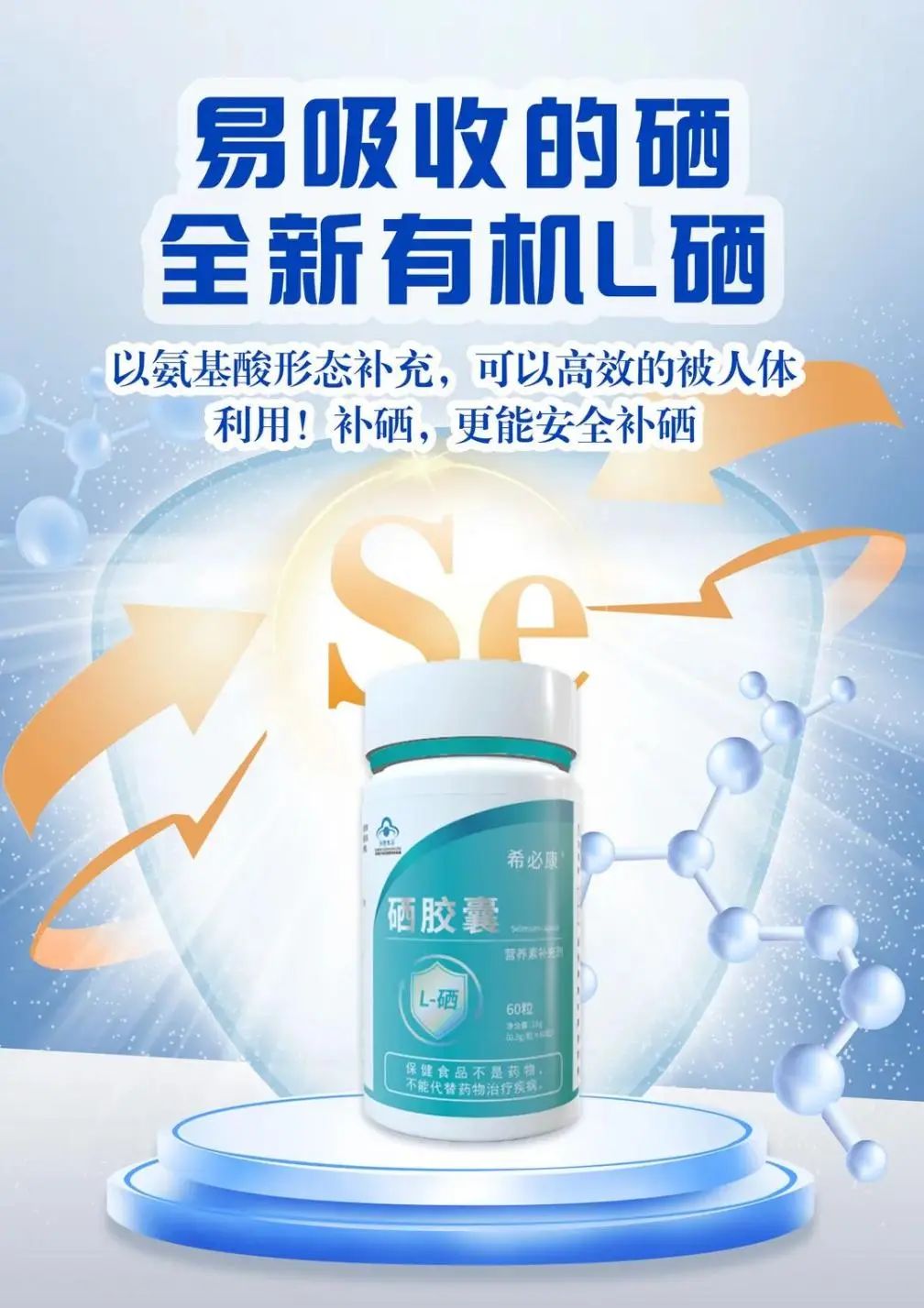 希必康牌硒胶囊是一款由:中国卫生部获批、美国FDA认定的,国内最新型第四代有机L-硒-甲基硒代半胱氨酸原料研制而成的高含量硒营养补充剂,是硒源类营养补充剂更新换代最新的国标产品,含硒(L硒)量高达100微克每粒,相比其它硒源,L硒是一种天然含硒氨基酸,属于天然有机硒化物有机硒源,是一种天然含硒氨基酸,主要化学结构为硒代半胱氨酸,是西兰花、大蒜、洋葱、野生韭菜等硒富集植物中硒的主要存在形式,是人类营养硒的最佳来源,也是目前最安全、最易吸收的有机硒形式,且吸收利用率高,具有较高的食用安全性。
