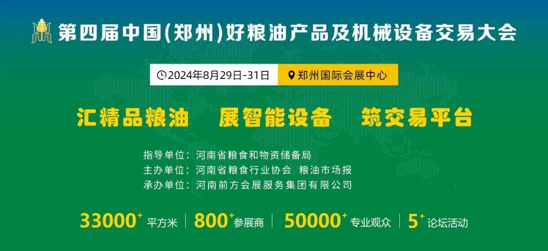 本届中原粮交会由河南省粮食和物资储备局指导,河南省粮食行业协会、粮油市场报主办,展览面积达33000+平方米,800+知名企业和50000+专业观众汇聚。展品范围涵盖好粮油产品类、粮油深加工食品类、机械设备类、粮油仓储及物流设备类、粮油行业信息服务类,中原粮交会将为粮油产品和机械设备企业开拓和巩固国内外市场、塑造品牌形象、扩大产品销售等提供最佳的交流贸易平台。
