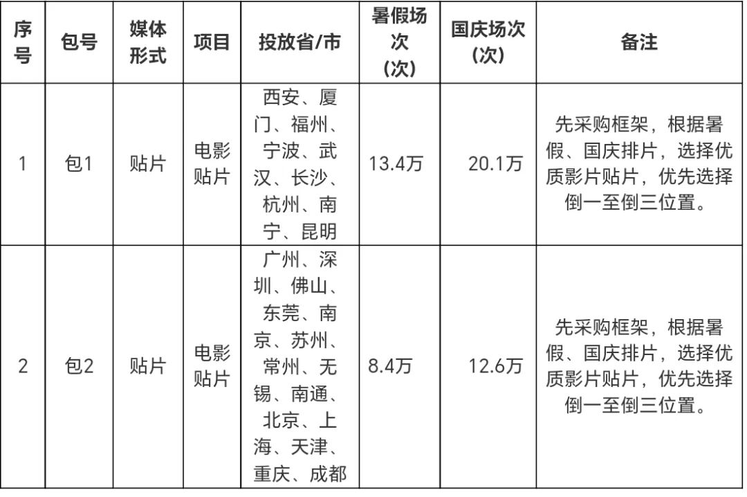 3.服务期:暑假档:2024年7月1日-2024年8月31日;国庆档:2024年9月25日至11月10日(以实际上下刊日期为准)。注:暑期、国庆两档场次为暂定分配数量,以采购人实际上刊需求为准。