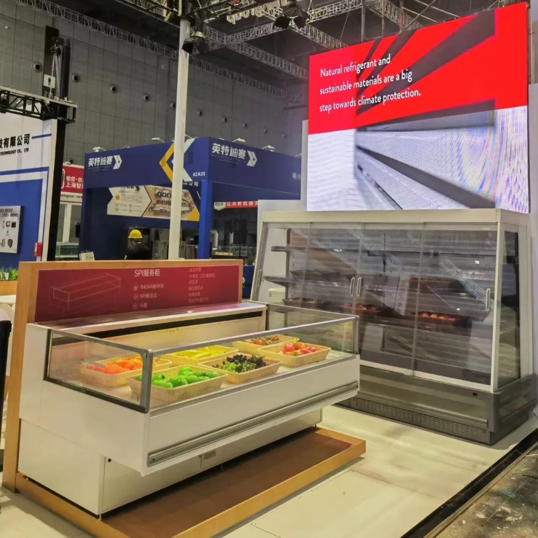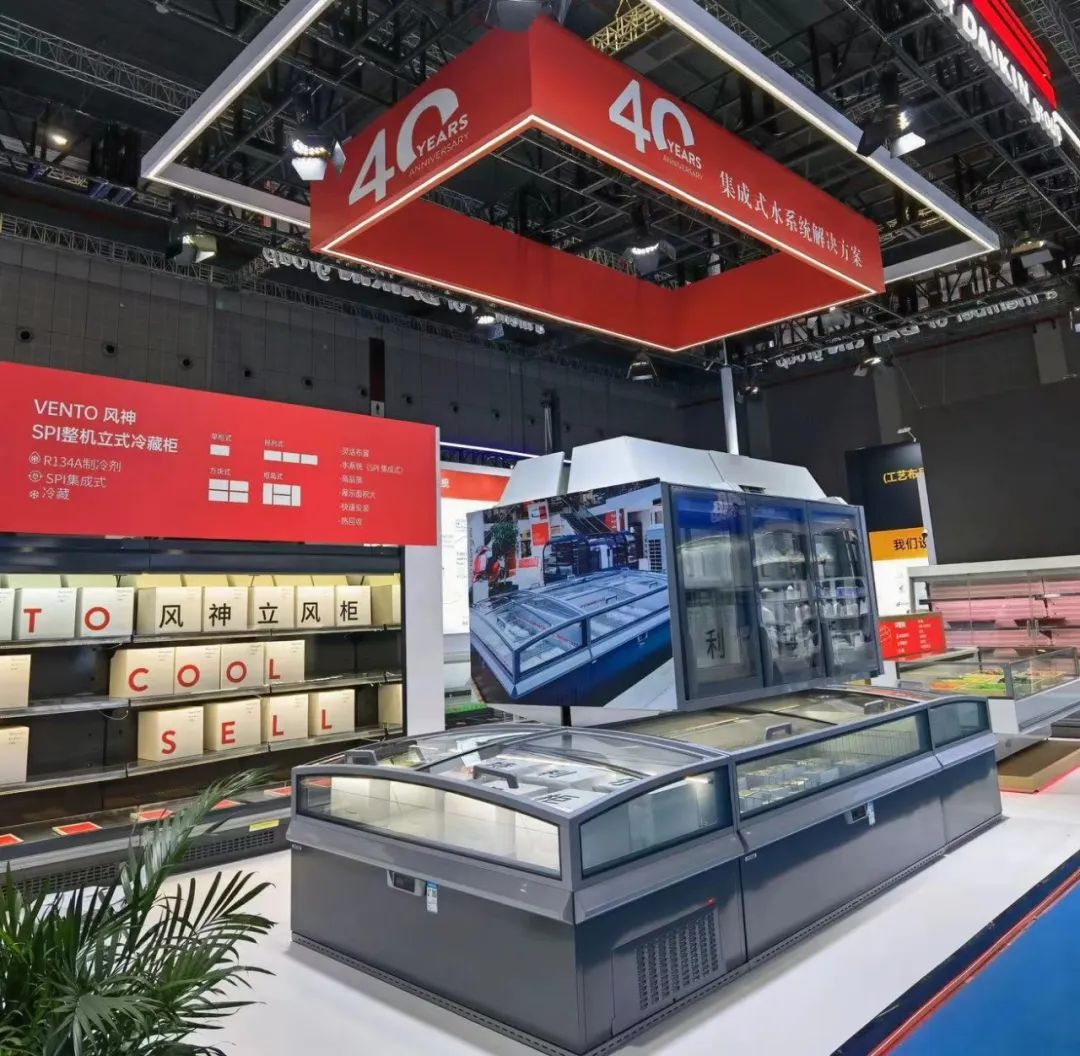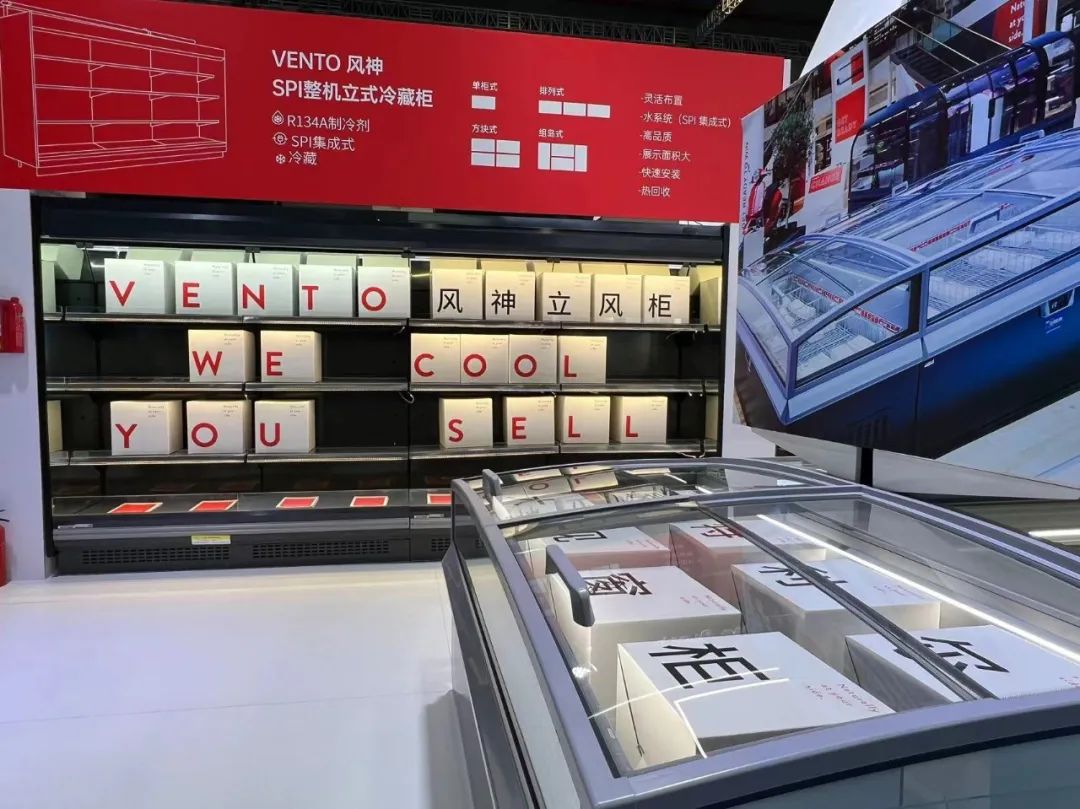 展台上,AHT奥特的蒙特利尔大视窗一体式岛柜;金利一体式子母柜;卡莱雅冷冻柜;风神立风柜、服务柜及熟食柜悉数登场,在聚光灯下接受观众的近距离品鉴。