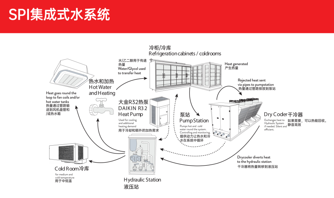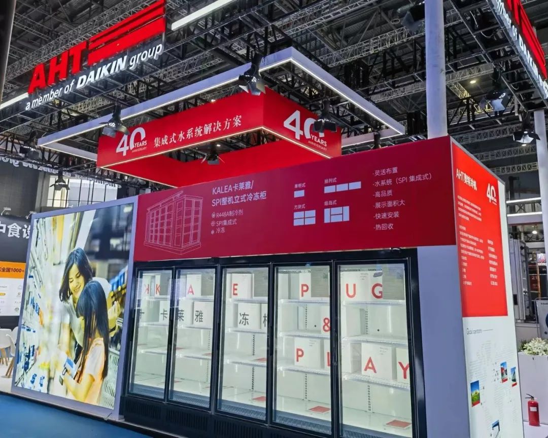 AHT奥特集成式水系统,即SPI (Semi-Plug-In) 半即插即用水系统,由自带制冷机组的多种柜体,使用水/乙二醇循环,提供整店解决方案,满足产品冷冻冷藏、冷库、余热回收等需求。此次奥特展示了水冷集成式Vento立风柜、Kalea玻璃门冷冻柜、半高柜、服务柜、熟食柜,并分享了国内的水系统应用案例,旨在推动绿色环保、安装维护方便的水系统在国内的应用,受到市场欢迎。SPI水系统包括:奥特即插即用(FPI,只需插电使用) 岛柜、半即插即用(SPI,插电并连接水管)立风柜、玻璃门冷冻柜等、冷库机组、水泵、干冷器及热能回收(选项)组成。柜体部分:即插即用集成式、优异的温度表现、高效节能、超大展示面积、外观时尚、高可靠性、质量稳定系统部分:高效节能、节省机房、安装简单、灵活布局(在预留水管接口的情况下)、系统维护方便成本低、热回收选项。