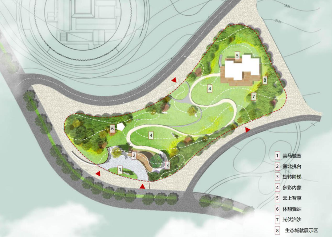 内蒙古园通过营造“开头、发展、高潮、尾声”的空间序列来组织入口空间、草原空间和建筑空间。来到内蒙古园,首先印入眼帘的是“美马驰赛”的骏马雕塑以及体现民族风情的“乌兰牧骑”浮雕景墙,沿着从左侧拾级而上来到依势而建的“塞北挑台”,在这里视线豁然开朗,可以一览草原的广袤之貌;从右侧拾阶而下,进入景墙后侧的“多彩内蒙”文化展示墙,在这里可以欣赏丰富而独特的草原文化;顺着象征草原河流的蜿蜒园路走入中心草原空间,在这里可以看到两侧自然成团的植物群落以及兼具休憩和智能互动的“智能休憩站”,一览草原舒朗风貌的同时展示内蒙古近些年在智能城市发展方面的新成就。草原末端视线的对景与游览的重点是“云上智享”,即内蒙古主展馆。主展馆以六边形“蜂巢”为设计理念,以模数化设计为基础,利用绿色建材,综合展示“建筑节能”的展览主题,整体所用材料90%可回收利用。建筑主体采用薄壁轻钢结构,外部利用本土节能环保材料发泡陶瓷板作为建筑的主要材料,发泡陶瓷是用粉煤灰等固体废料作为原材料,高温烧制的陶瓷,与传统建筑材料相比较,发泡陶瓷具有轻质、保温,隔热,隔音的优良性能。建筑内部通过现代化、科技化的展陈方式展示内蒙古本土文化和本地建筑节能企业践行新发展理念所取得的突出成就,展示一个前进的、现代的、高质量发展的内蒙古。