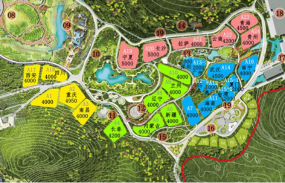 (内蒙古园紧邻园中房、箬笠广场、新疆、辽宁、甘肃等展园)