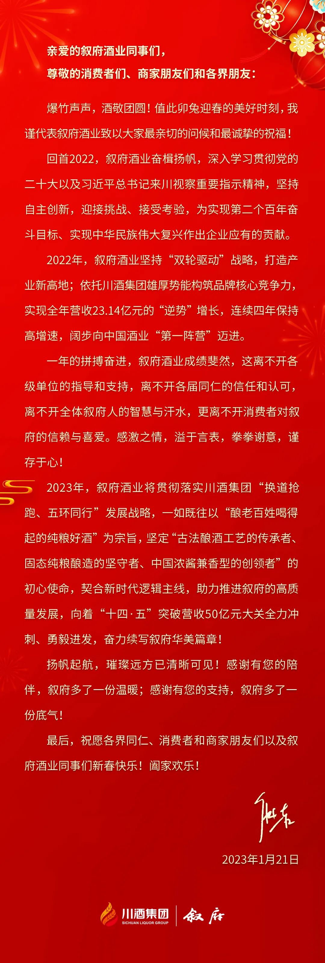 爆竹声声,酒敬团圆。叙府酒业董事长熊吉发表新春贺词,向一直以来支持叙府酒业的消费者们、商家朋友们和各界朋友表示感谢,