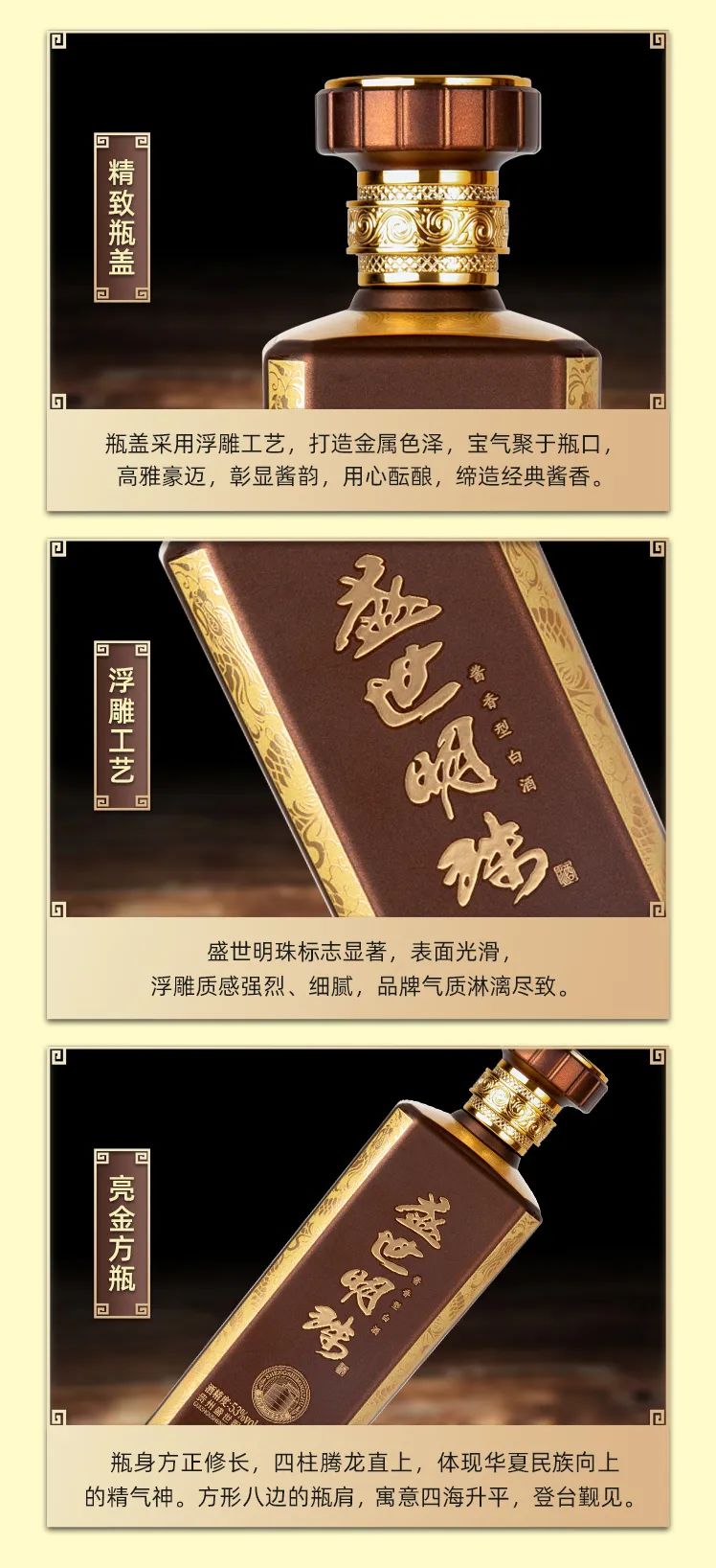 盛世明珠以品质和创新为基石,持续向高品质酱香的理想追求前行。品质不仅是消费者的基本需求,更是盛世明珠坚守长期主义的压舱石。盛世明珠在多个领域进行创新探索,不断提升产品品质和品牌差异化优势。其三款盛世系列产品更是经过了全面升级,呈现出更为丰富、协调、舒适的口感和酒香,成为高端品质的最佳见证。