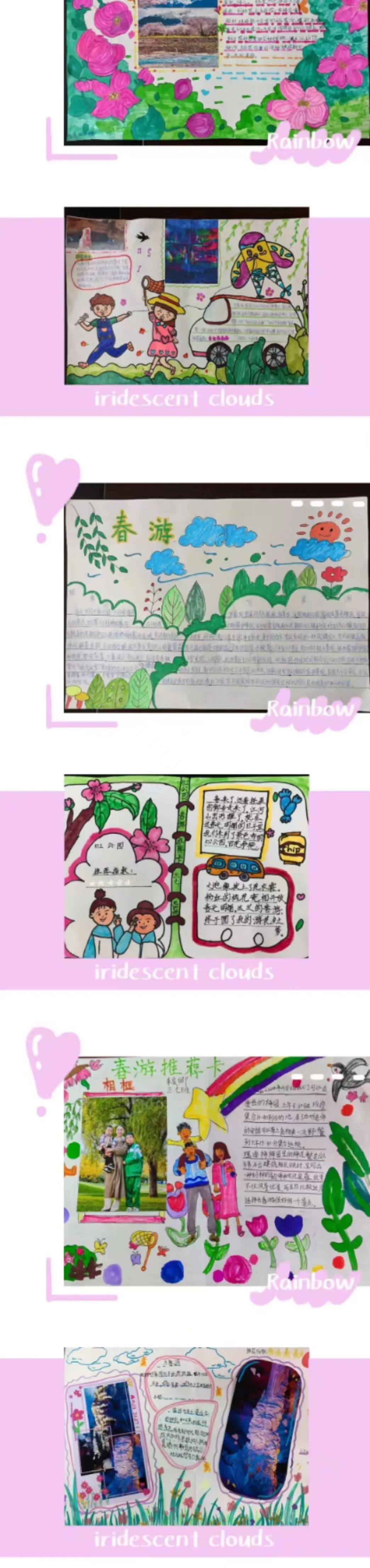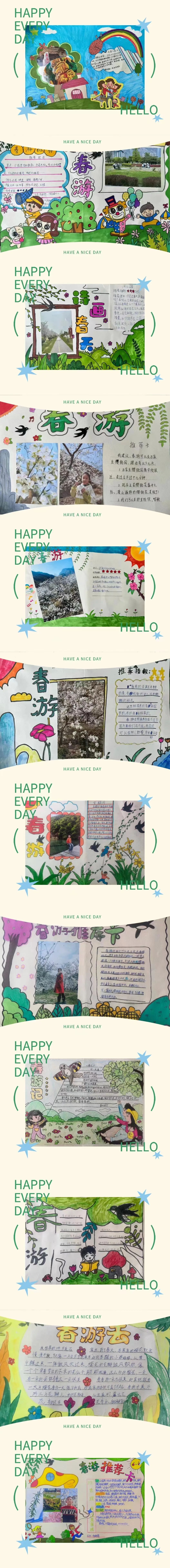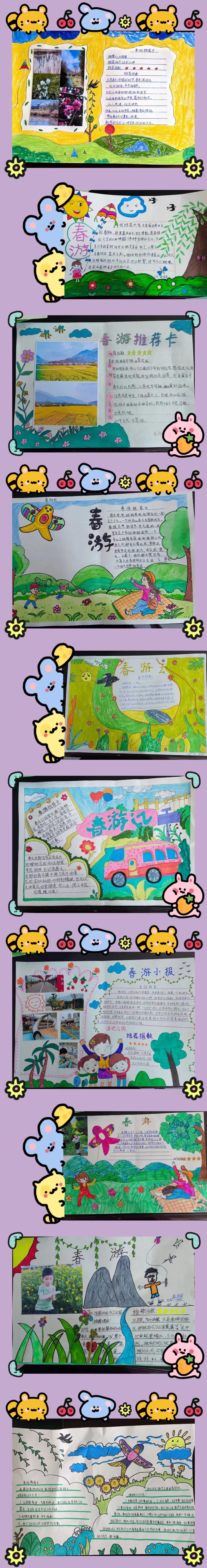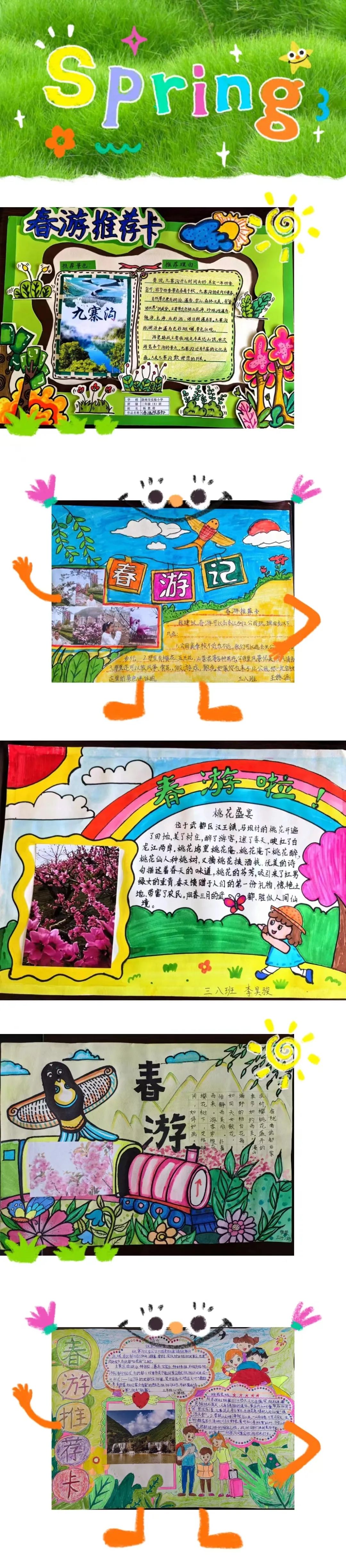 看,春天在他们的眼中是如此的美妙!春天的颜色真是五彩缤纷,太阳是红灿灿的,天空是湛蓝的,树梢是嫩绿的,迎春花是娇黄的……难怪诗人喜欢吟诵春天,画家爱描绘春天,因为春天是世界一切美的融合,一切色彩的总汇。同学们制作的春游推荐卡是如此的绚烂多姿。