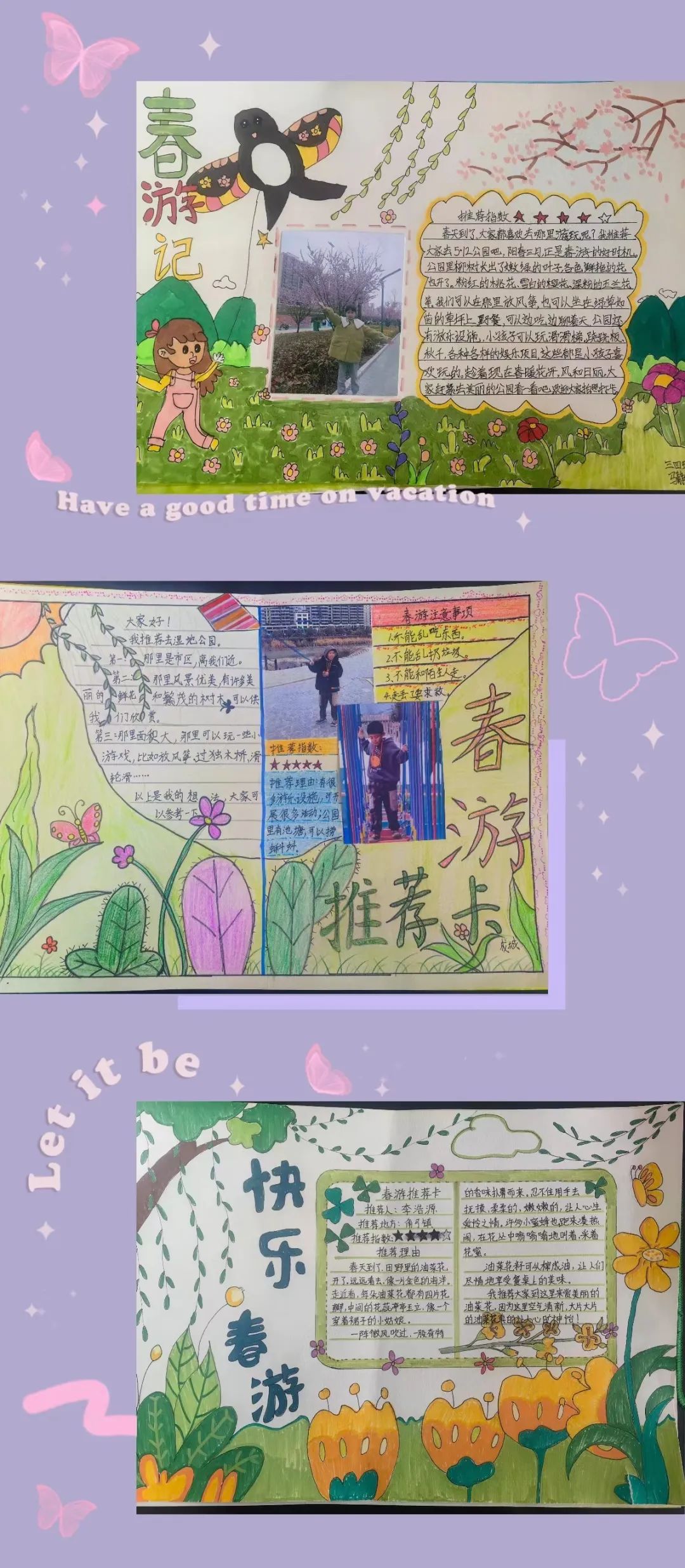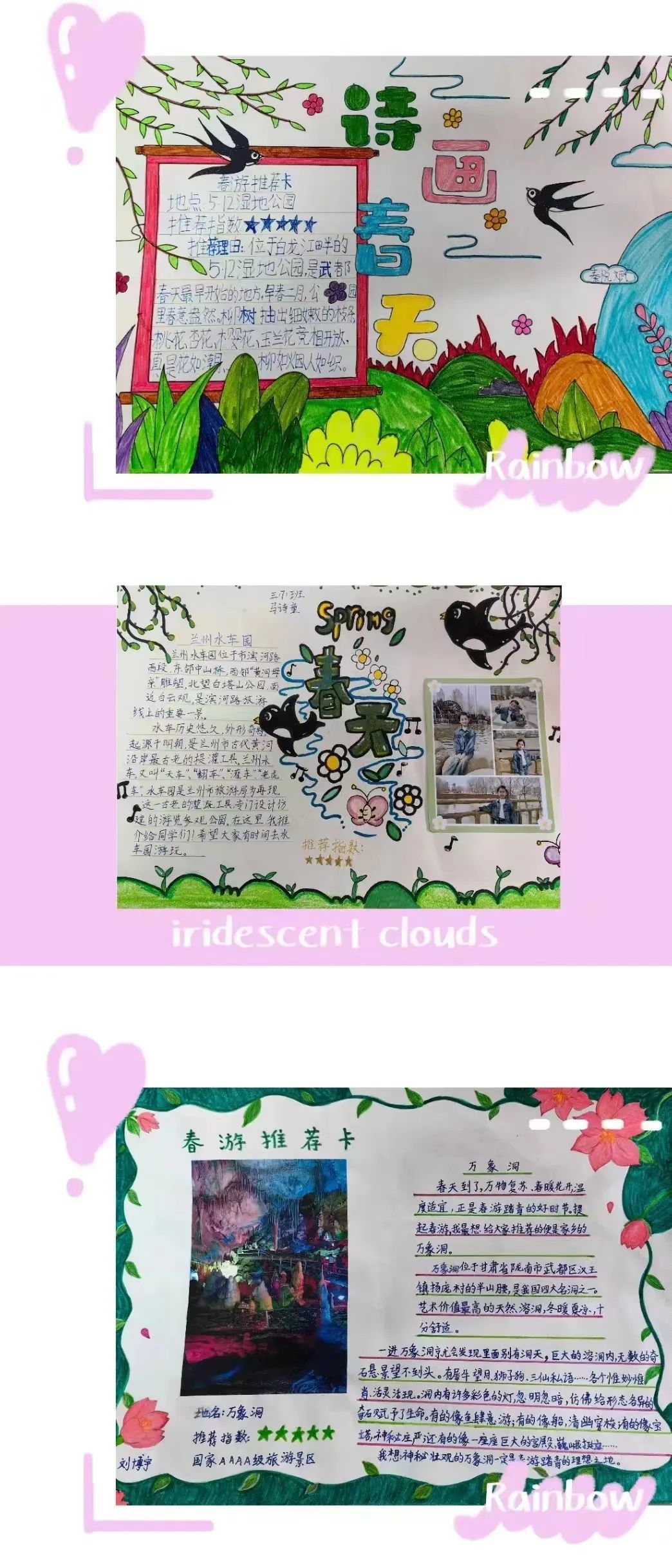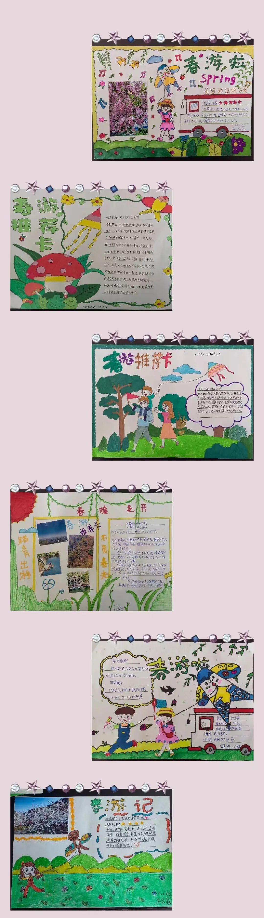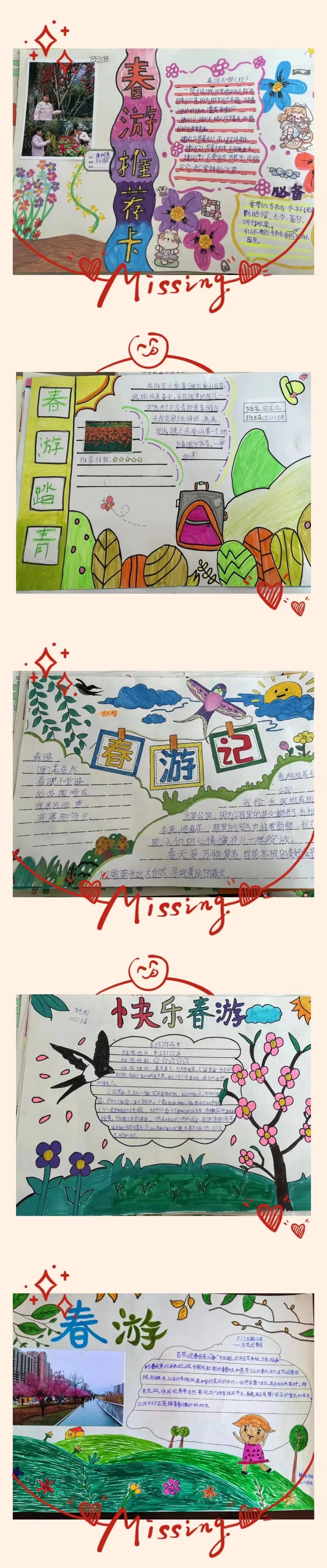 看,春天在他们的眼中是如此的美妙!春天的颜色真是五彩缤纷,太阳是红灿灿的,天空是湛蓝的,树梢是嫩绿的,迎春花是娇黄的……难怪诗人喜欢吟诵春天,画家爱描绘春天,因为春天是世界一切美的融合,一切色彩的总汇。同学们制作的春游推荐卡是如此的绚烂多姿。