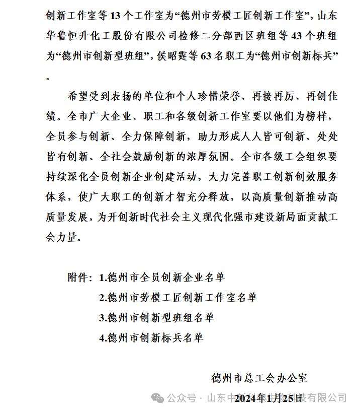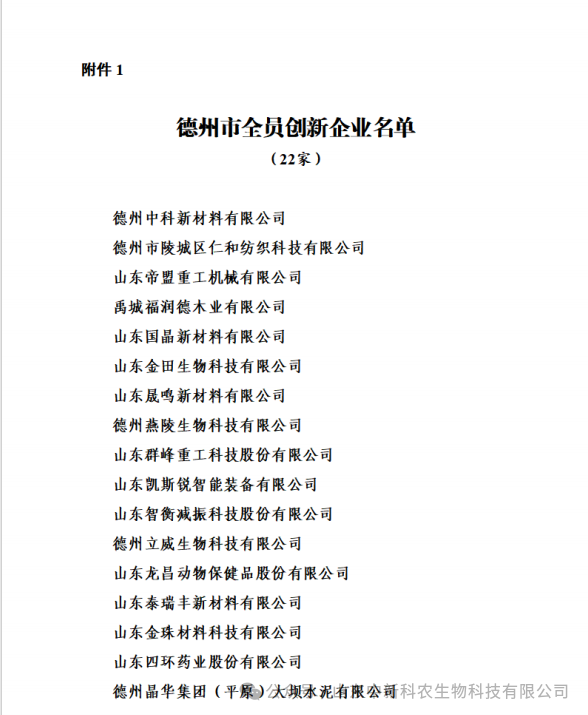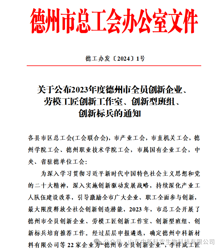 近期,德州市总工会公布2023年度德州市全员创新企业、劳模工匠创新工作室、创新型班组、创新标兵评选结果,山东中新科农生物科技有限公司成功入选德州市“全员创新企业”。