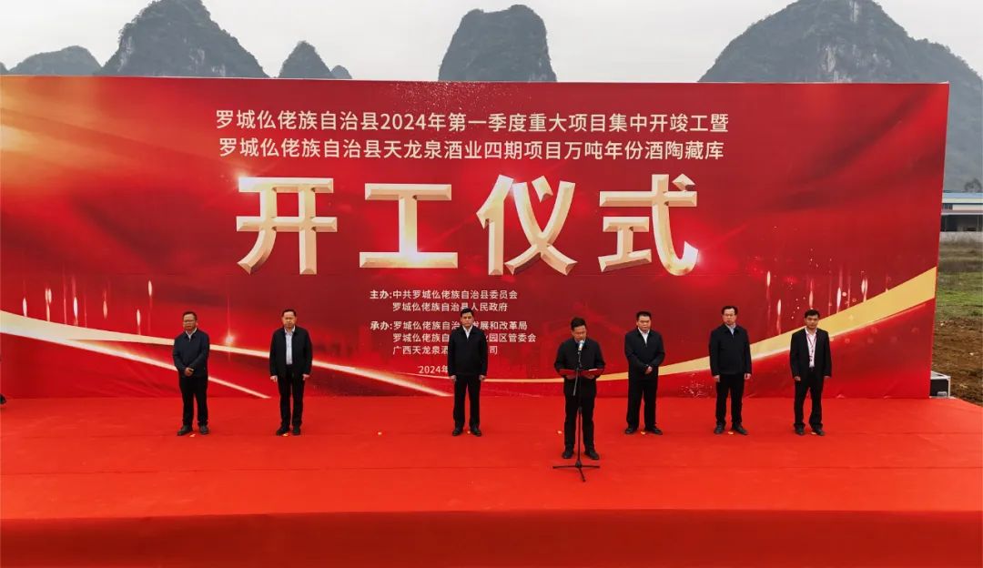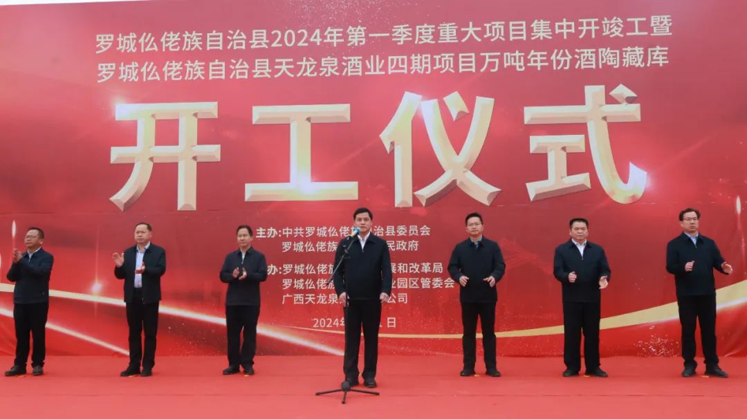 第三项议程由河池市人民政府副市长陈翻腾同志宣布罗城仫佬族自治县2024年第一季度重大项目建设集中开(竣)工活动暨罗城仫佬族自治县天龙泉酒业四期项目万吨年份酒陶藏库正式开工!