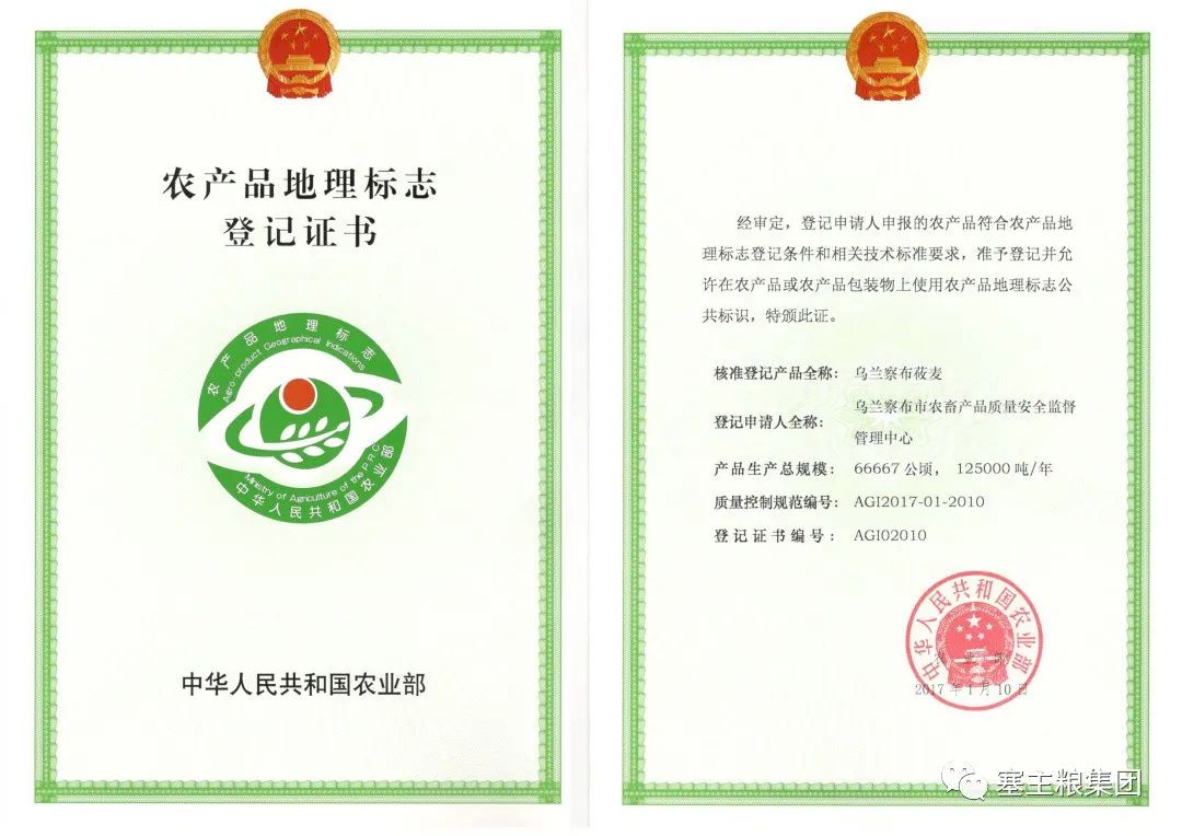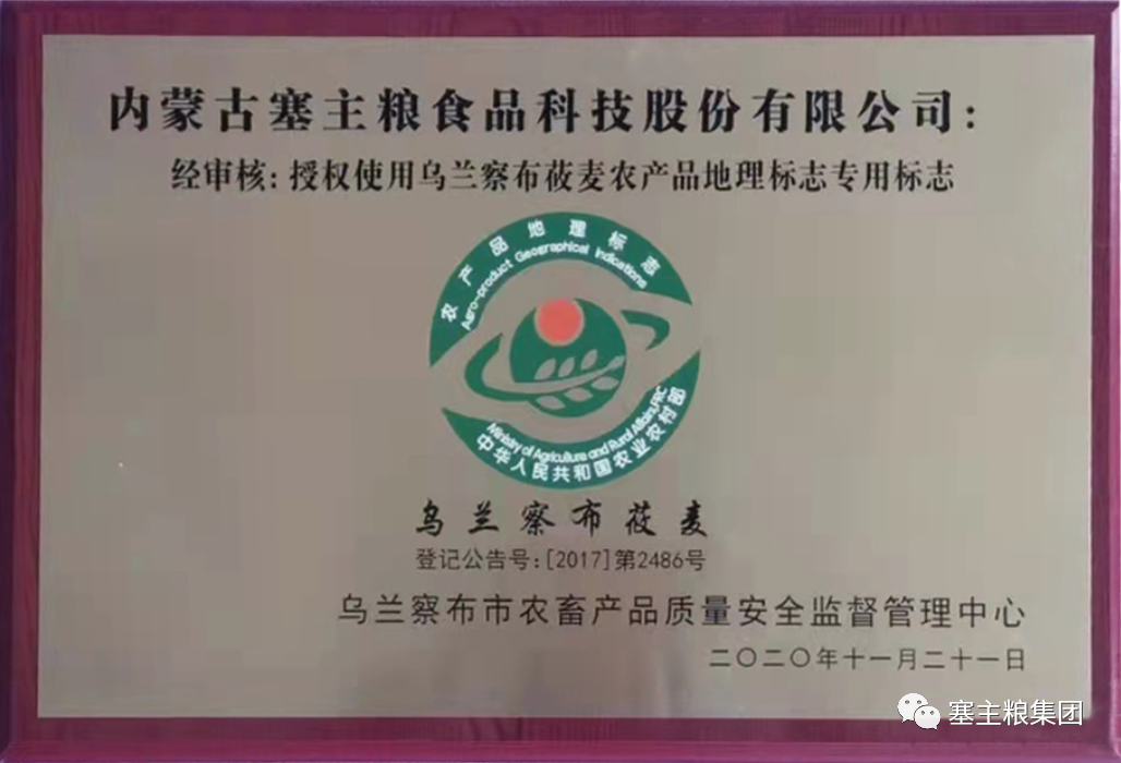 2017年,塞主粮集团成为行业内第一个通过审核并使用“农产品地理标志”的企业,证书编号:001。