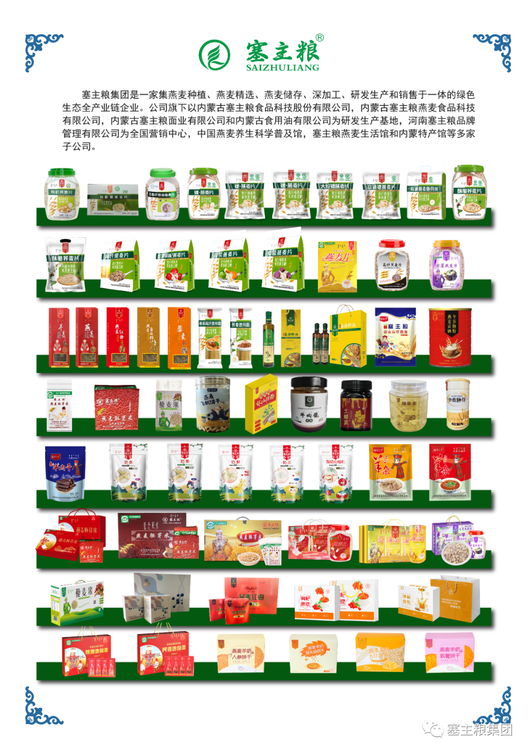 塞主粮集团自主研发生产的产品达六十多种,有机燕麦胚芽米、燕麦胚芽米、有机裸燕麦片、富硒裸燕麦片、大粒裸燕麦片、燕麦富硒全谷物粉、燕麦速食面、荞麦速食面、藜麦速食面、亚麻籽速食面、红曲速食面、藜麦米、亚麻籽油、沙棘原浆、枸杞原浆、益生元怀山药粉、奶制品和牛肉干等内蒙优质特产。塞主粮万亩地标裸燕麦种植基地,位于乌兰察布察右前旗,2017年乌兰察布燕麦成为乌兰察布市第八个地理标志产品。