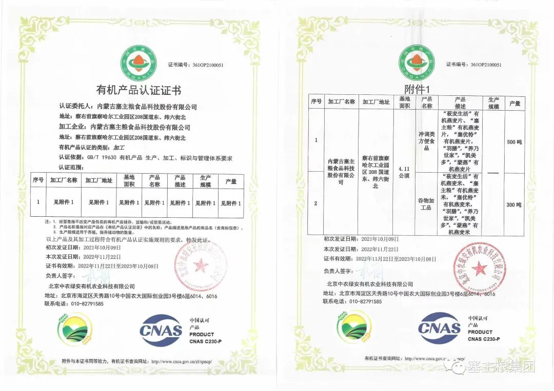 2021年,塞主粮燕麦胚芽米、燕麦片系列等产品获得有机产品认证,证书号:361OP2100051