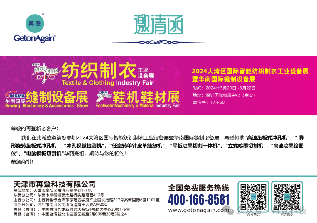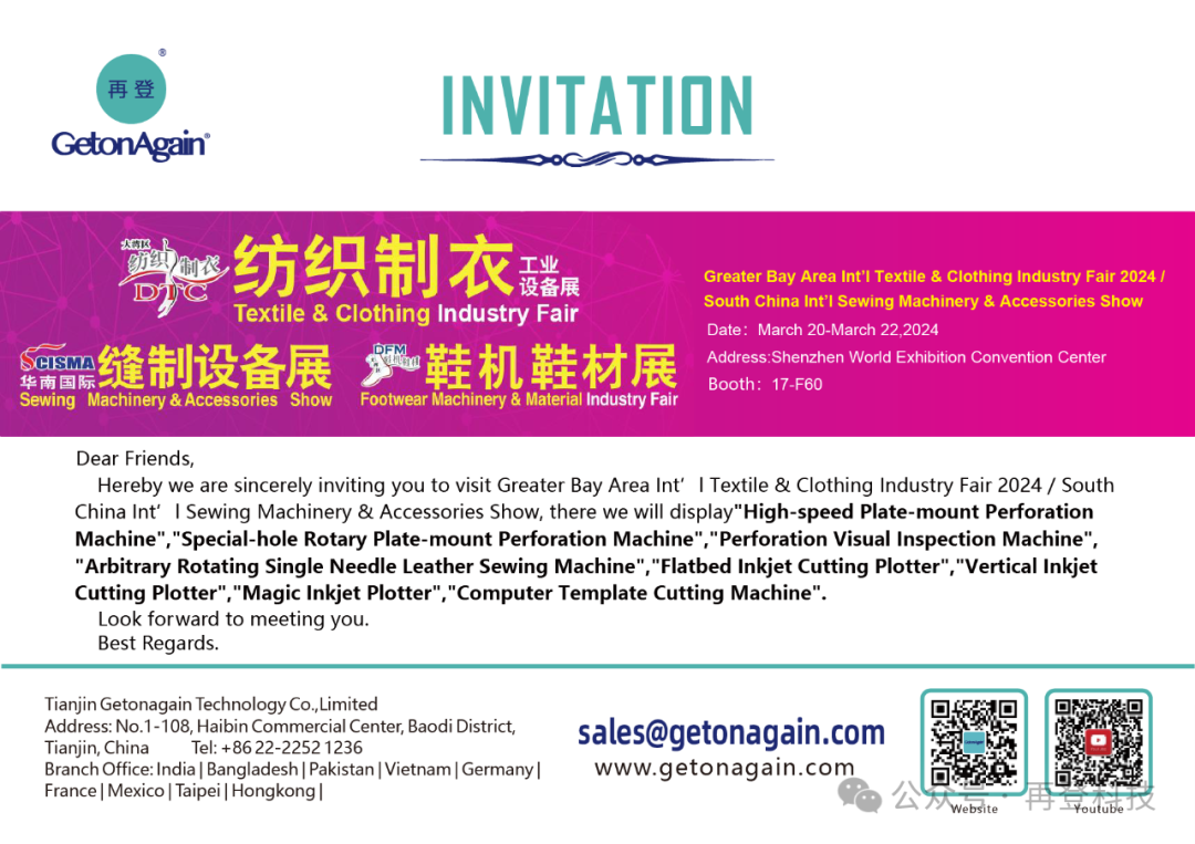 March 20, 2024, the 2024 Greater Bay Area Int'l Textile & Clothing Industry Fair 2024 / South China Int'l Sewing Machinery & Accessories are grandly opened at the Shenzhen World Exhibition Convention Center (Bao’an). GetonAgain Technology is displaying the "High-speed Plate-mount Perforation Machine", "Special-hole Rotary Plate-mount Perforation Machine", "Perforation Visual Inspection Machine", "Arbitrary Rotating Single Needle Leather Sewing Machine", "Flatbed Inkjet Cutting Plotter", "Vertical Inkjet Cutting Plotter", "Magic Inkjet Plotter" and "Computer Template Cutting Machine", all those to make a grand appearance.