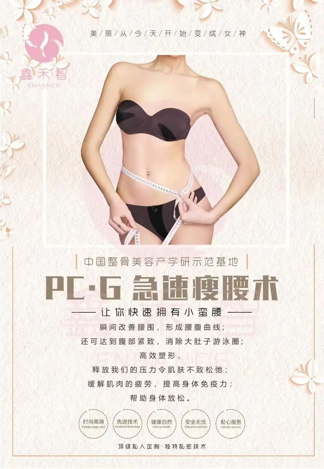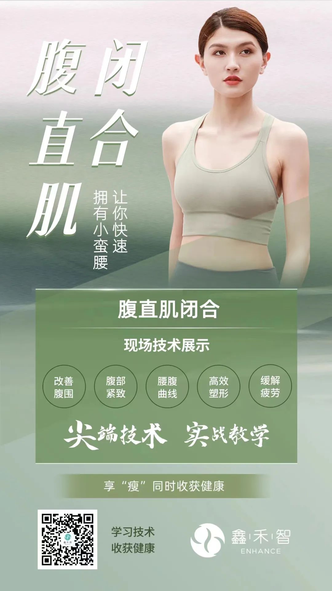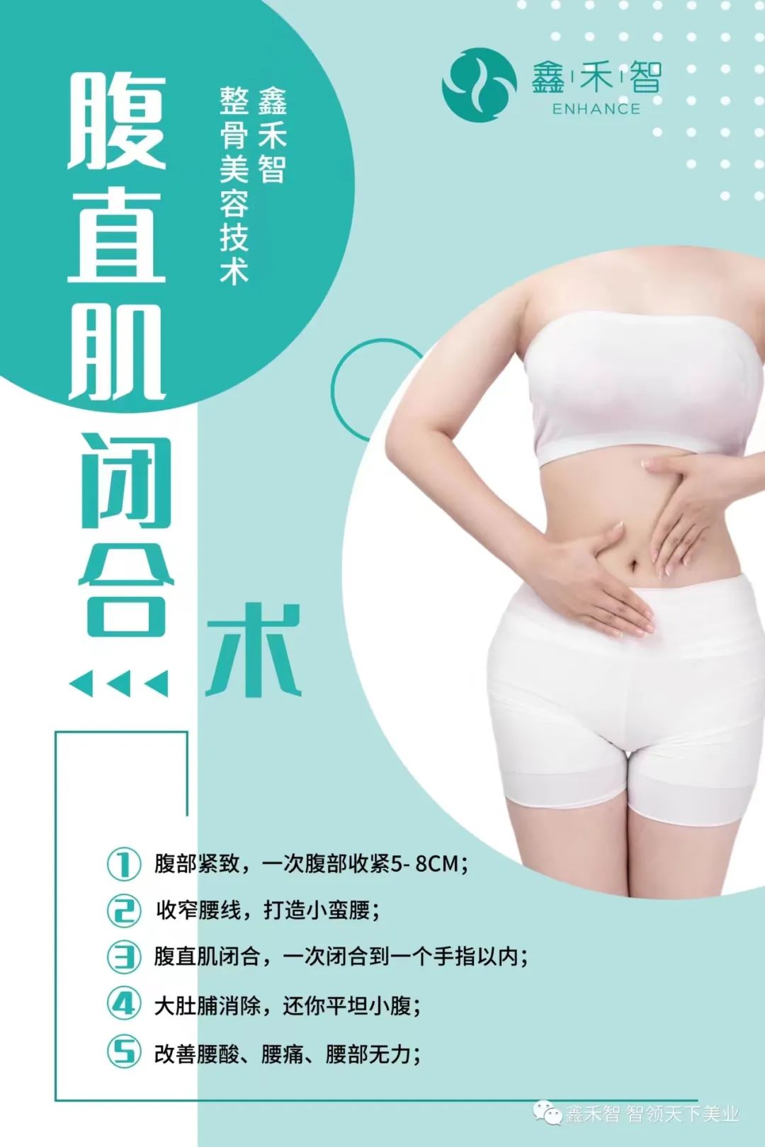 腹直肌闭合术是通过鑫禾智整骨美容手法刺激与强化腹部肌群外,配合呼吸激活深层腹部肌群,通过手法和呼吸刺激,促进身体新陈代谢,减少脂肪堆积,从而恢复腹部皮肤、肌肉、筋膜弹性和紧张度,从而恢复应有的腹直肌弹性!