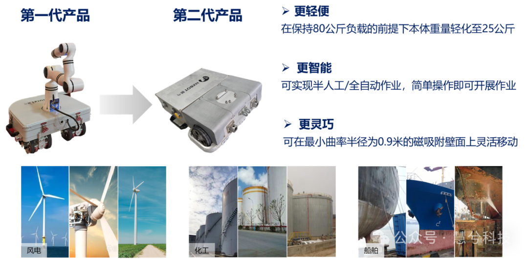 公司已在第一代爬壁机器人的基础上进行全方位的升级,形成了第二代爬壁机器人产品,相比第一代更轻便、更智能、更灵巧。慧兮科技将继续秉承“创新、协作、共赢”的理念,不断探索和创新,推动新能源、船舶、石油化工等行业的高空运维作业智能化升级!