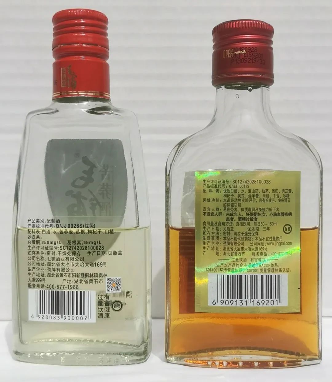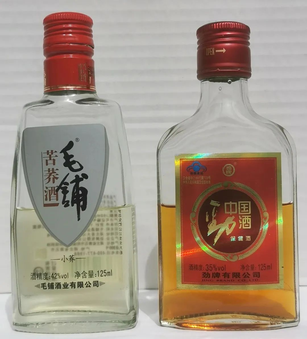 图中的劲酒是保健酒中的代表酒,产品有“健字号”标志(右);毛铺苦荞酒是配置酒(左)
