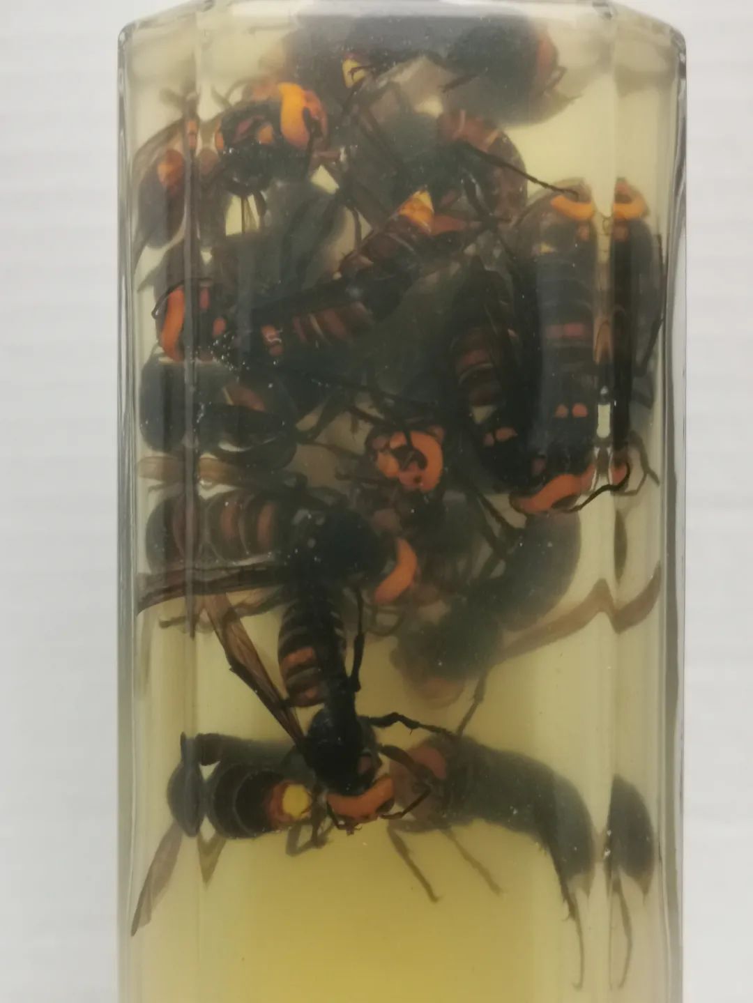 畲家虎头蜂酒的酒体部分特写,据店家介绍是从山上捕捉的野生虎头蜂,体型很大。酒瓶里放了不少,约占1/3;摇晃之后酒体浑浊,乳白色的沉淀物飘起,说明是真正的泡了野生虎头蜂。至于其究竟有什么疗效,在什么情况下饮用,还得按照药酒的使用方法,听从医生的建议