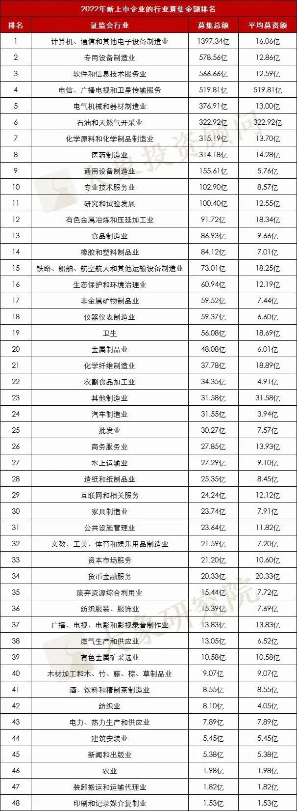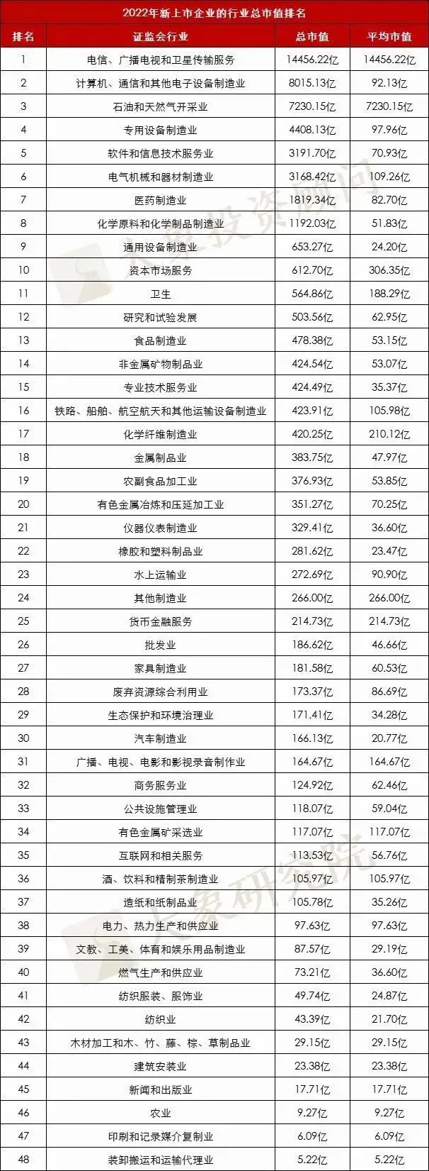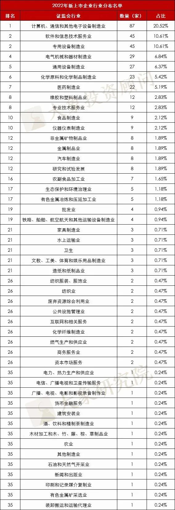 据统计,2022年A股新上市企业的424家,分布在48个行业中。