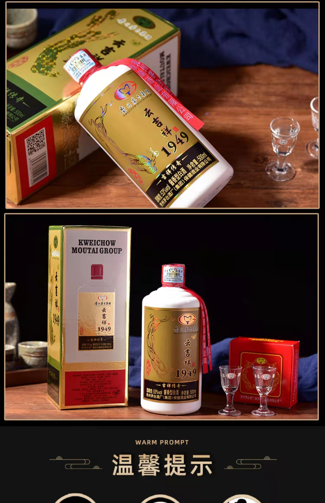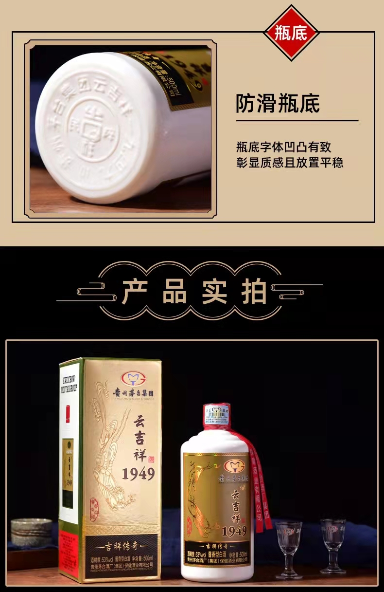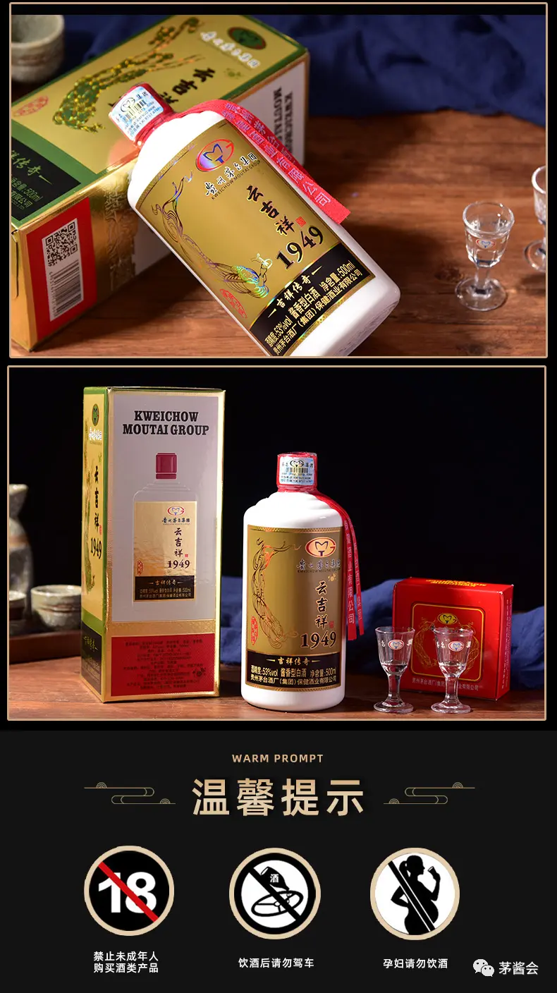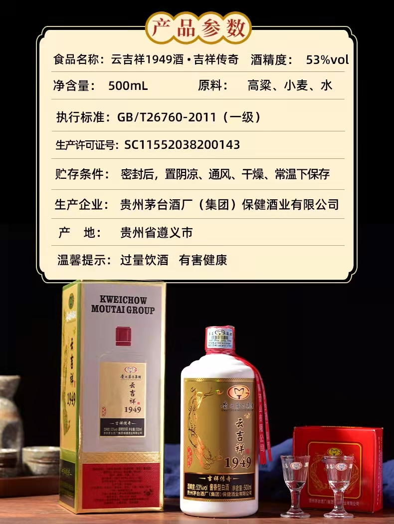 云吉祥1949酒·吉祥传奇秉承酱香传统工艺酿造,以糯高粱、小麦、水为原料,采用大曲酱香型白酒传统工艺精心酿造、贮存、勾 兑而成,未添加香气、香味物质。酒体饱满,香味协调馥郁,酱香风格突出,口感平顺绵滑,入喉绵柔。