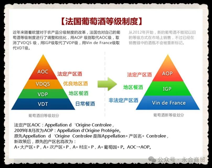 旧世界的葡萄酒有着严格的等级标准,精细而完整的制度使得旧世界在产区、葡萄品种、产量、采摘方式和酿造都有着严格的规定,最为经典的就是法国的AOC(原产地控制命名)制度。