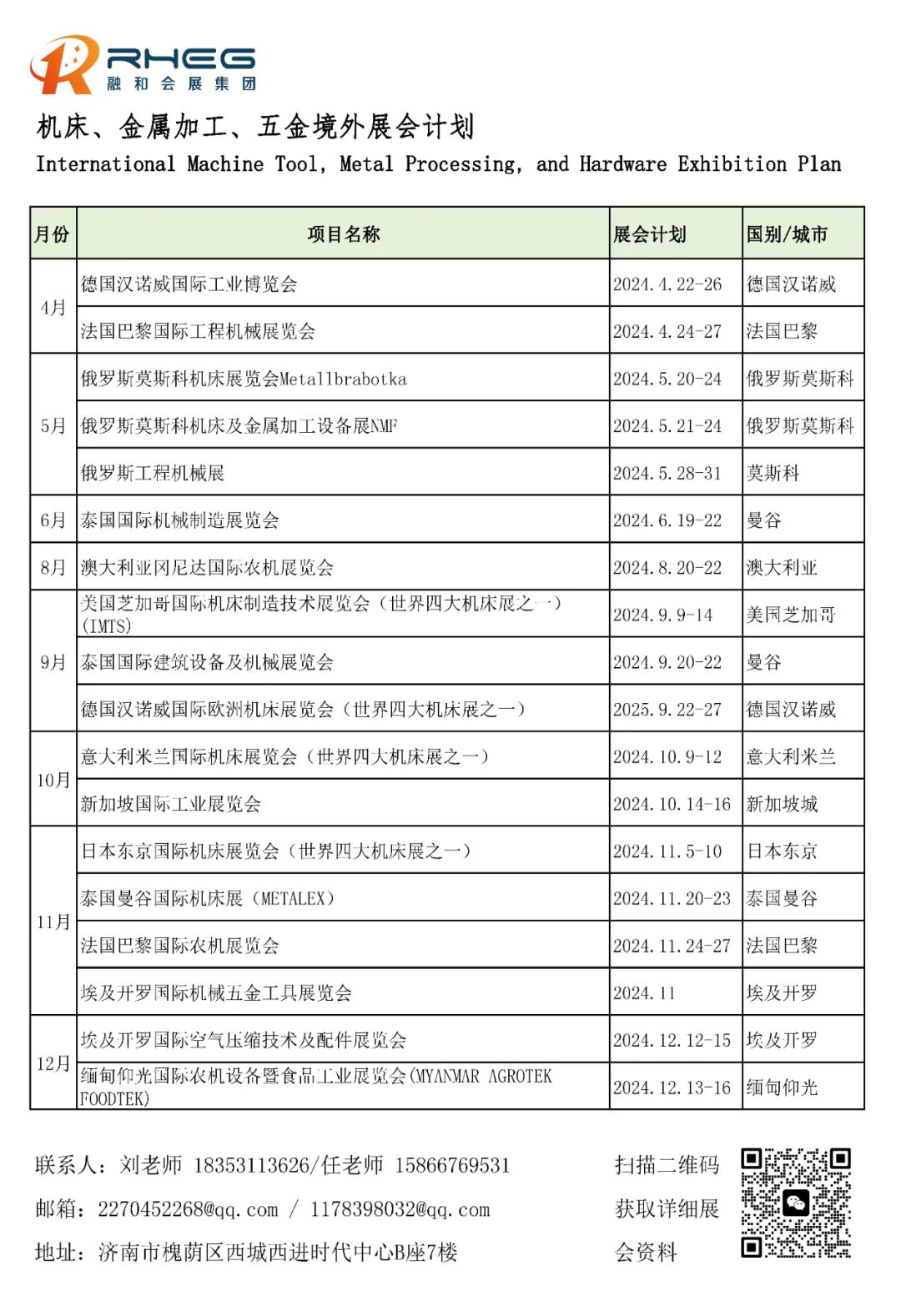 2024年是开放的一年,各级政府鼓励和支持企业出海,利用境外展会深度开拓国际市场,获取海外订单。以下为部分机床、金属加工、五金境外展会,如有意参展单位请可联系工作人员获取展会详细资料。(位置有限早定早选)