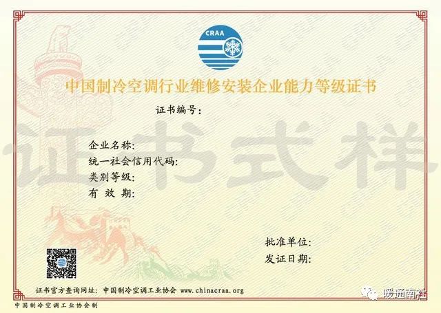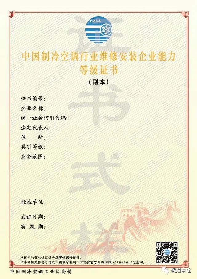 4.中国制冷空调行业维修安装企业能力等级证书有效期3年,有效期内实行年度审核制,年度审核应比其发证月提前 2个月提出申请;有效期满须提前 3个月办理期满换证复核手续。