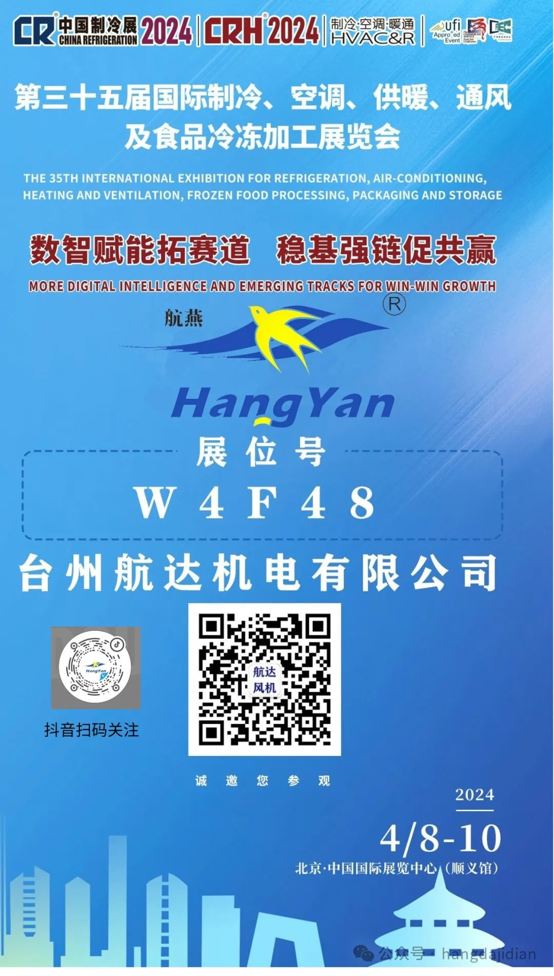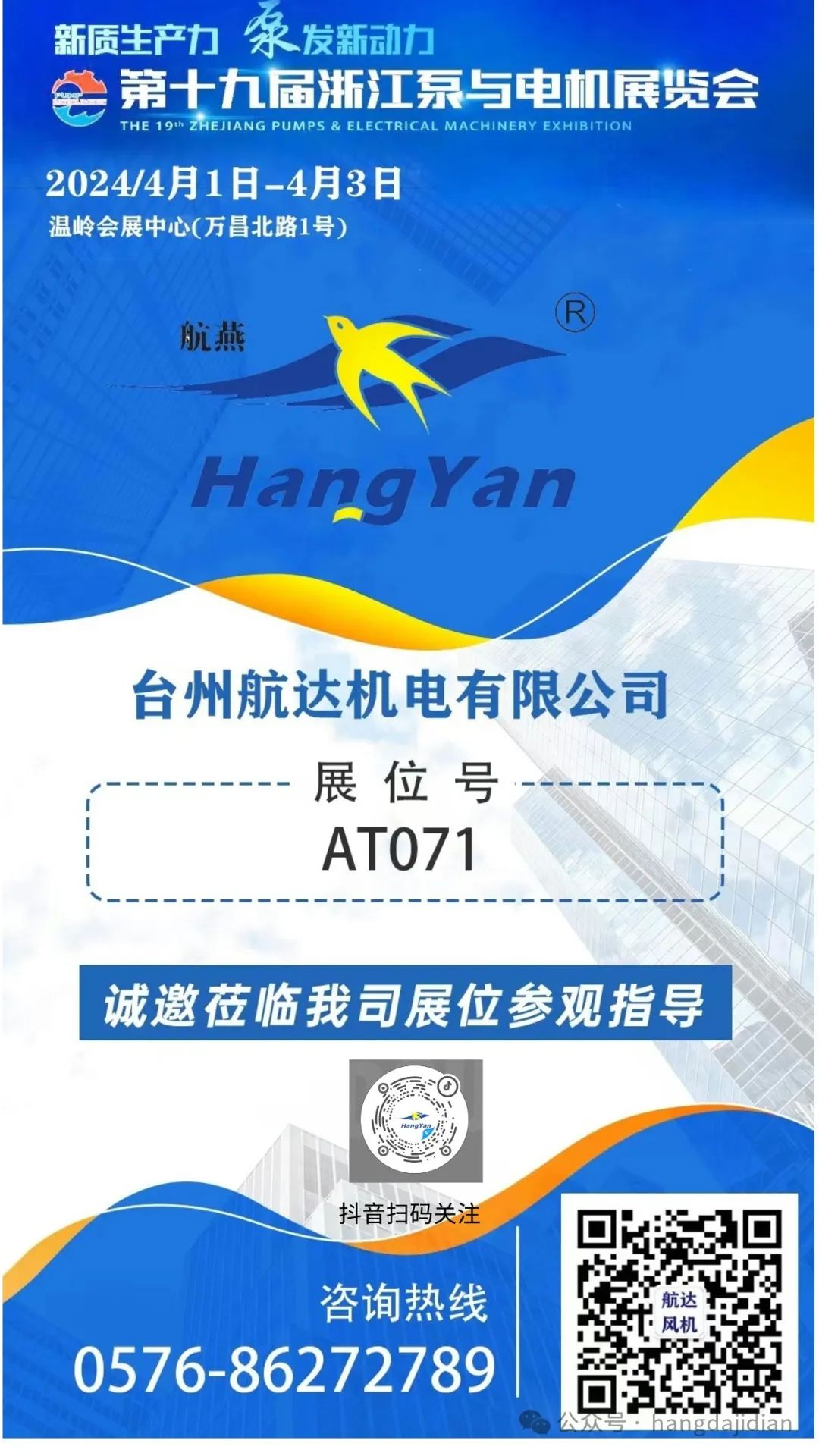 2024年4月1-3日第十九届浙江泵与电机展览会将于在温岭会展中心(万昌北路1号)举行,2024年4月8-10日第三十五届中国制冷展在北京·中国国际展览中心(顺义馆)举办,航达风机将携热门风机系列产品精彩亮相,诚挚邀请您莅临展位参观指导!我们在温岭会展中心(展会号AT071)及北京·中国国际展览中心顺义馆(展位号W4F48),与您不见不散哦!