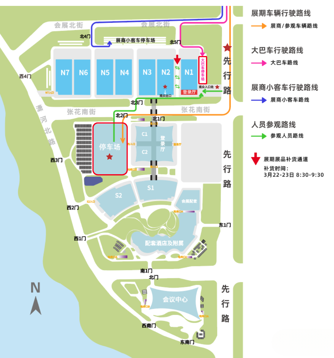 请注意:本次展会的入口在先行路与张花南街交叉口西侧——NI观众登录厅,选择自驾前往的观众,请按照现场指引把车停在停车场(具体方位见下图),请各位一定注意,千万别跑冤枉路哦~