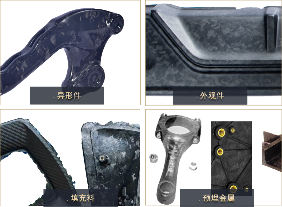 碳纤维SMC可以作为表观材料也可以作为次结构性材料,还可以预埋金属件成型,作为填充料等等,目前被广泛地用于大批量地制造交通运输、运动器材、医疗器械、电子设备、高端消费品市场、特殊装备等所需更高性能且轻质的复杂结构的复合材料部件,以及需要新花纹的装饰性部件。
