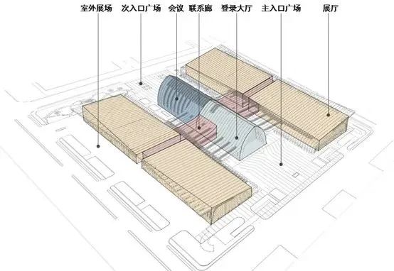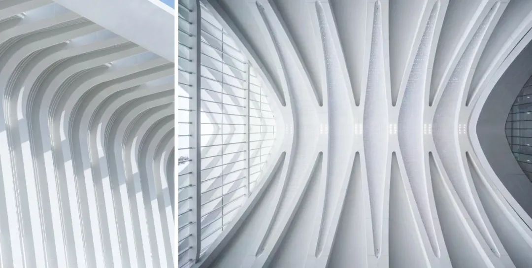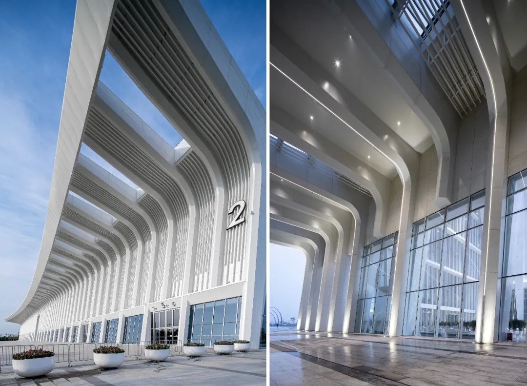 以灰白色为主,设计简洁,突出整体的形式序列感。采用张弦梁无柱结构体系大面宽布局形式,为展览活动提供了极大的灵活性和多样性。