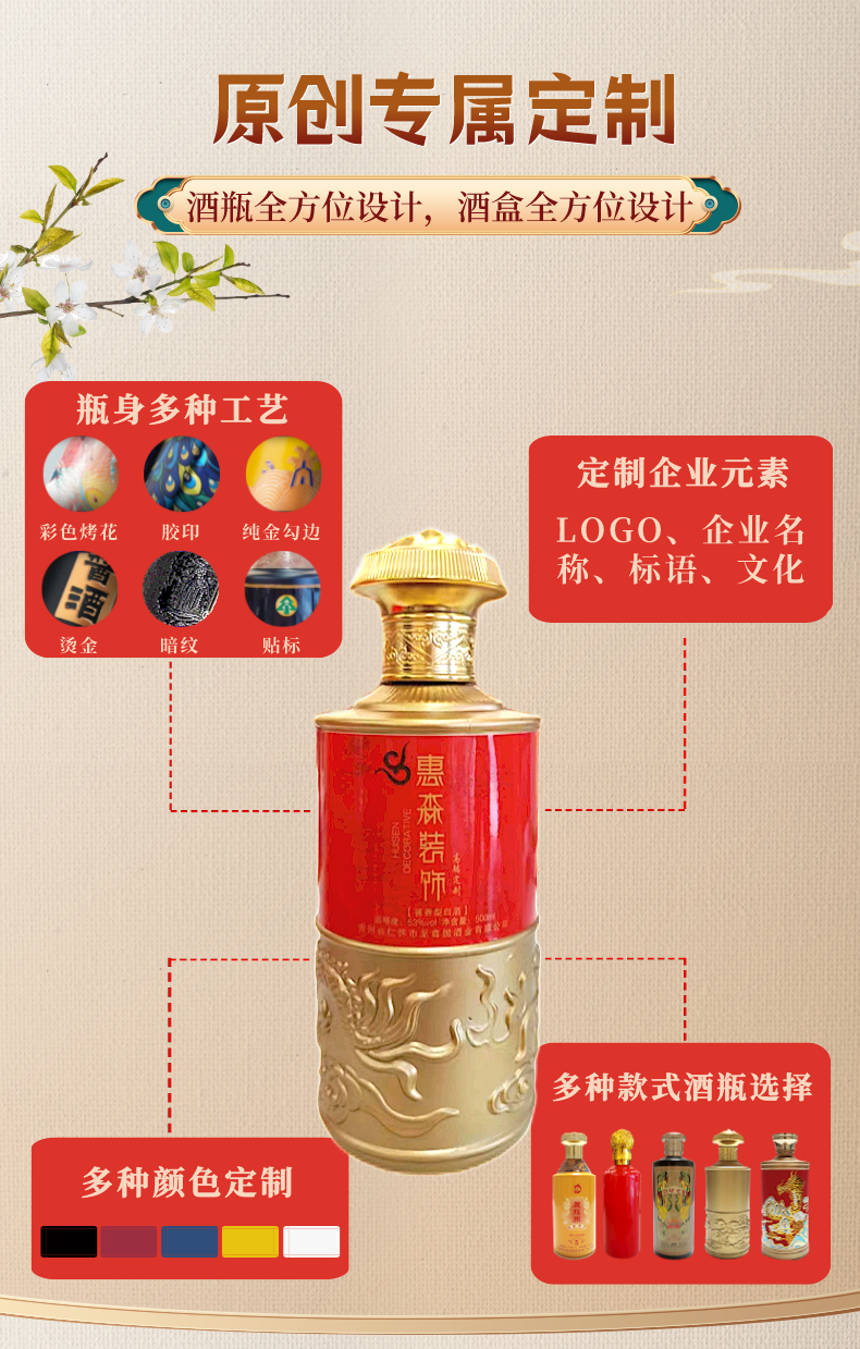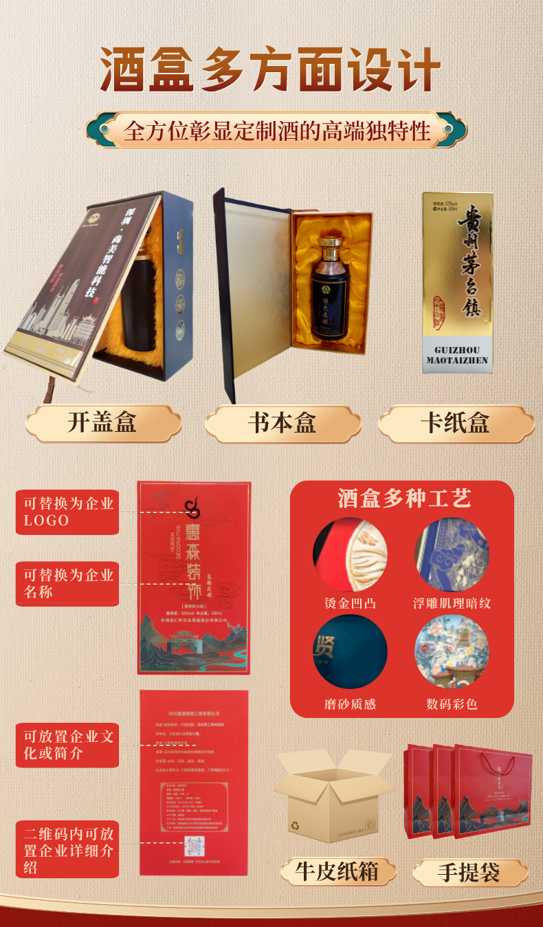 定制酒不仅在瓶中独特,在外观上也一样引人注目。我们有专门的设计师和包装厂,我们将根据您的品牌风格和主题,精心设计独特的包装,从瓶身设计、外箱包装,到个性化的酒标,确保每一瓶都是一件艺术品,值得收藏。