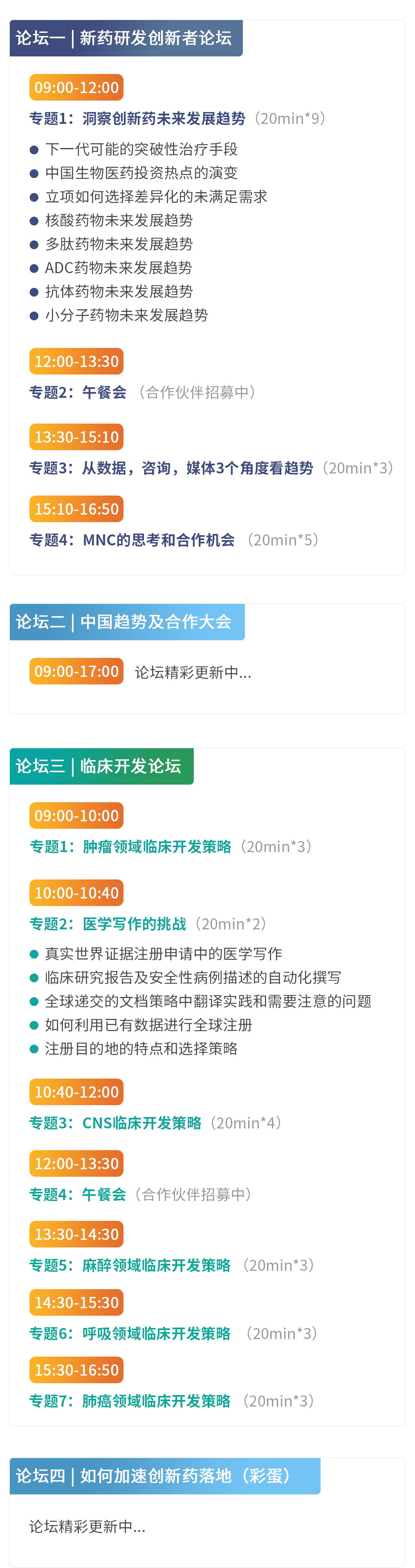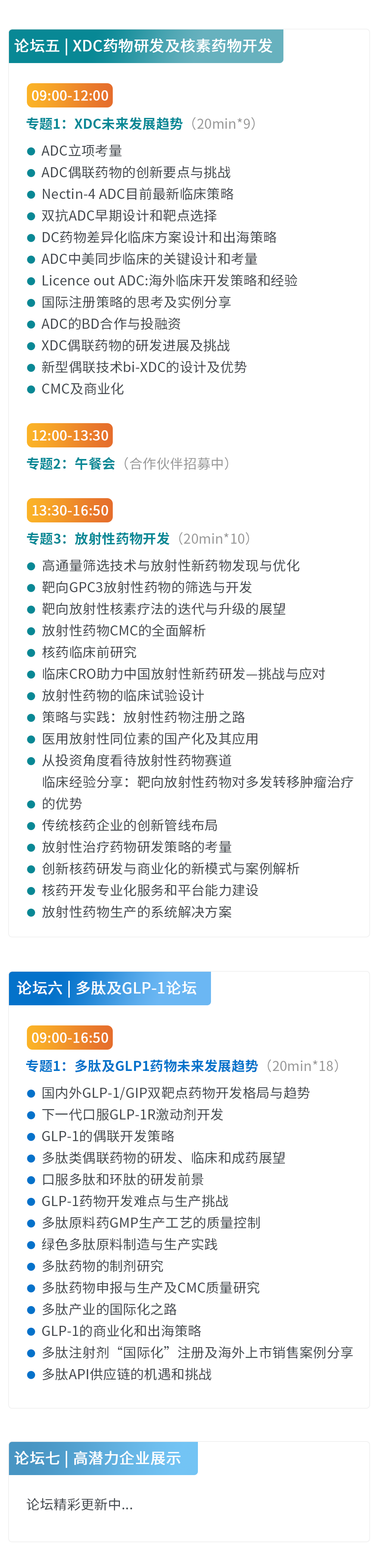 大会开放各类专属支持方案及超350个现场展位,可为生物药/化学药相关新药/仿制药药学研发机构CRO/CDMO等企业提供展位、演讲、联合主办、晚宴冠名、项目路演、卫星会、明星打造等多形式的宣传展示。
