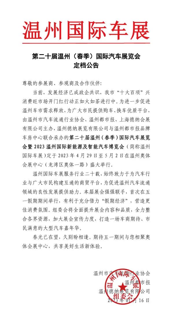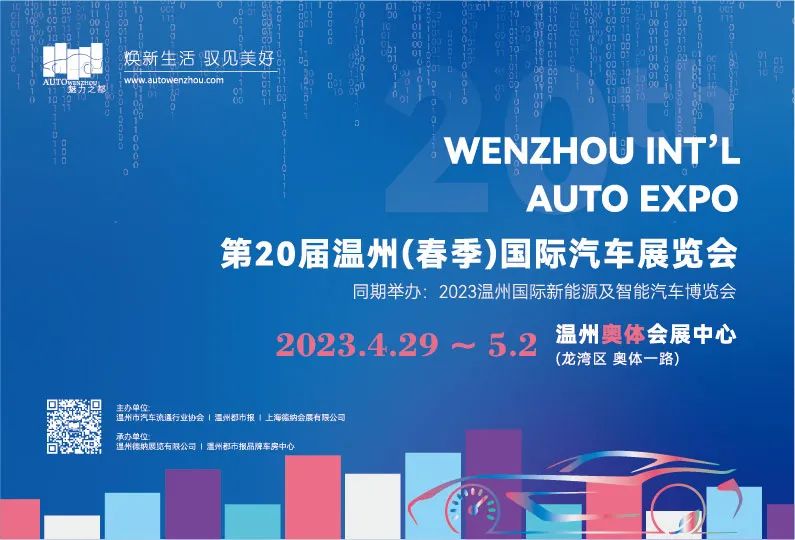 第二十届温州(春季)国际汽车展览会暨2023温州国际新能源及智能汽车博览会定于04月29日至05月02日在温州奥体会展中心(温州市龙湾区奥体一路)举办。
