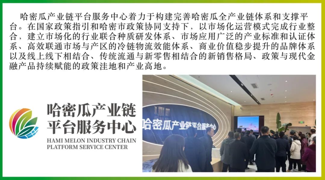 [1]五大分中心指:哈密瓜产业链平台服务中心下设的种质研发中心、标准认证中心、鲜果冷链物流中心、品牌流量推广中心及行业结算金融中心。
