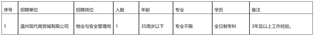 温州现代商贸城有限公司为温州市鹿城区国有资产经营集团有限公司下属国有企业,注册资金1875万元。现因工作需要,决定面向社会公开招聘工作人员1名(其他用工形式),有关要求如下: