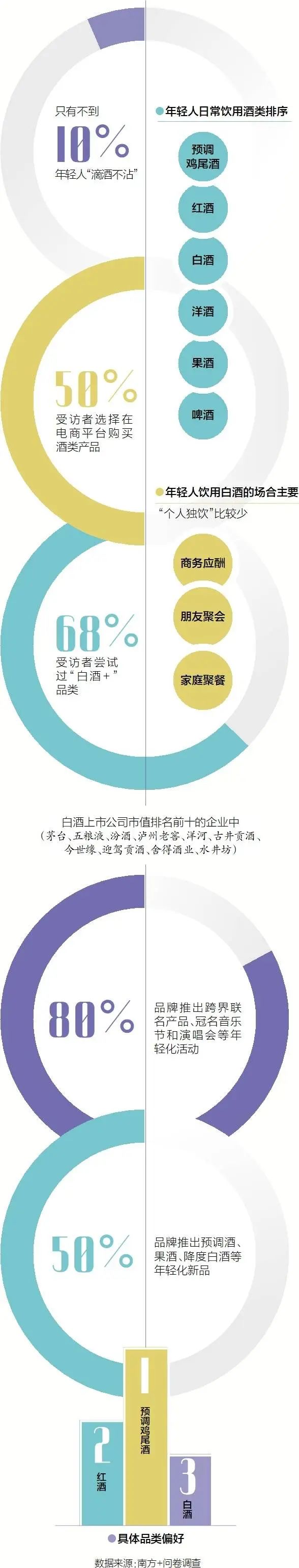 根据媒体的调查结果显示,只有不到10%的年轻人“滴酒不沾”。在年轻人日常饮用的酒类中,涉及白酒、洋酒、红酒、预调鸡尾酒、果酒和啤酒。在具体品类的偏好上,白酒排名第三,在预调鸡尾酒和红酒之后。预调鸡尾酒依托低度、口感好和饮用方便等优势,在年轻人中快速崛起。跨界咖啡、冰淇淋、预调酒……白酒创新品类成功覆盖了年轻群体,68%的受访者尝试过“白酒+”品类。调查显示,茅台是年轻消费者最为熟悉的品牌。调查结果还显示,年轻人饮用白酒的场合主要还是“商务应酬”、“朋友聚会”和“家庭聚餐”,“个人独饮”比较少。不过,大部分人偏好的状态是“小酌”和“微醺”。此外,女性饮酒群体比例扩大。在市场分化的背景下,白酒产业步入新的调整转型期,呈现出向主流品牌、主力产品集中的趋势。稳健向好发展的白酒头部名优品牌积累了自身的优势,形成较为稳固的头部市场,在中国消费市场中展现出顽强的生命力。在白酒年轻化进程中,头部名酒发挥着积极作用。根据公开资料不完全整理,包括茅台在内的白酒上市公司市值排名前十的企业中。有80%品牌推出跨界联名产品、冠名音乐节和演唱会等年轻化动作,50%品牌推出预调酒、果酒、降度白酒等年轻化新品。作为网络“原住民”,年轻人群体主要从线上获取信息,受线上信息的影响也更大。调查结果显示:50%的受访者选择在电商平台购买酒类产品。在媒体看来,白酒实现年轻化有三部曲:先占领心智,推出跨界联名产品、冠名音乐节和演唱会,在营销层面介入年轻群体。随后推出预调酒、果酒、降度白酒等年轻化新品。随着年轻化战略的逐步深入,像茅台这样的头部品牌还专门成立品牌“茅小凌”来聚焦年轻群体。白酒企业频繁地跨界和联名,让品牌在年轻人心中的好感度有所提升。过去,当提起白酒时,消费者会联想起什么?“聚餐”“应酬”“酒局”成为关键词。在访谈中,不少年轻人透露出对白酒存在刻板印象。所以,喝什么酒?喝多少?都不是自己说了算。年轻人的话语权相对较低,需要迎合长辈的喜好。因此,改变白酒“老气横秋”的形象,需要迎合年轻人的喜好,创造出更多主动饮酒的场景。同时,他们更喜欢“微醺”而不是“酩酊大醉”,享受白酒带来的松弛感。为实现心智种草,从年轻人日常生活中的咖啡、冰淇淋、茶饮入手,利用创新品类带动品牌年轻化也是各大名酒品牌的思路。茅台冰淇淋,便是茅台实现冰淇淋与白酒创新融合的冰淇淋新品。去年,一杯酱香拿铁,撬动了巨大的市场想象空间。2023年9月,贵州茅台与瑞幸联合推出的“酱香拿铁”成为现象级营销:开售首日单品售卖出540万杯,销售额超过1亿元。因此,茅台将酱香拿铁作为与年轻人的纽带,使得茅台品牌在年轻消费者心中具备持续的熟悉度。华南理工大学教授、品牌研究所所长段淳林看来,“酱香拿铁”并不是孤例。近年来,白酒轰轰烈烈开展“白酒年轻化”战略。段淳林指出,品牌年轻化需要经历,消费者认识品牌、与品牌建立联系、使用产品、形成一定品牌忠诚度四个阶段,这个周期十分长。不同的品牌在影响力和品牌调性上各不相同,转型也讲究“天时地利人和”,需要一些契机。“茅台用这样的方式,很快被很多人认识了。”媒体认为,如何促使从认知的改变到行为的改变,“白酒+”是一个好切口。通过跨界,白酒品牌保持和年轻人同频共振。苦、辣、呛!在访谈中发现,年轻人对第一口白酒的印象并不佳。如何提高第一口酒的适口性,成为了白酒厂商一个必答题。去年年底,茅台农业与莫其托合作推出的“贵州味道”系列鸡尾酒。宣传片中,周杰伦代言,配上其熟悉的作品《mojito》作为背景音乐。有了周杰伦的加持,产品备受好评。据悉,这款“东方口味特色的鸡尾酒”,上市一周内,首批1500箱合计9000瓶售罄。这是白酒年轻化的一个缩影。在白酒的年轻化进程间,采取的策略是产品先行。例如,降度和降量,试图用低度化、偏柔和的口感来适应年轻消费者的喜好。在实践中,衍生出两种路径:以白酒为基酒,做成果酒或预调酒、将白酒度数降低,培养年轻人的白酒口感。前者可以称为白酒年轻化1.0版本,后者则为升级版。在白酒年轻化1.0时代,不少酒企推出了预调酒系列产品。茅台以“中高端女性的专属果酒”为定位推出了子品牌悠蜜,目前的主推款为蓝莓精酿,酒精度在13度左右,口感类似葡萄酒有半干型和半甜型,整体价位在289—759元。到了白酒年轻化2.0时代,不少企业已开启低度化战略,低度白酒的酒精度仍在30度左右。可以发现,白酒品牌正面向年轻群体,积极从产品侧转型,满足消费者聚会、露营、独饮等悦己新需求。为了降低消费门槛,培育新粉丝,酒企正在加大力度变革他们的营销方式和销售渠道,加码包括直播、新型电商平台等业务模式服务年轻的用户群体。不论是会员中心还是自营APP的渠道建设,都是酒企在渠道变化的背景下,主动接近年轻人的尝试,便于满足消费者的多样化需求。在品牌直营渠道方面。截至去年12月31日,“i茅台”平台注册用户数超5300万,平台在2023年交易额累计超280亿。线上白酒渠道的快速发展为白酒行业的破局提供了有力支持,也让业内对于渠道年轻化的必要性有了更直观的感受。谈论渠道变革,自然离不开DTC模式。新消费时代下,受数字媒体、电商渠道等因素影响,消费市