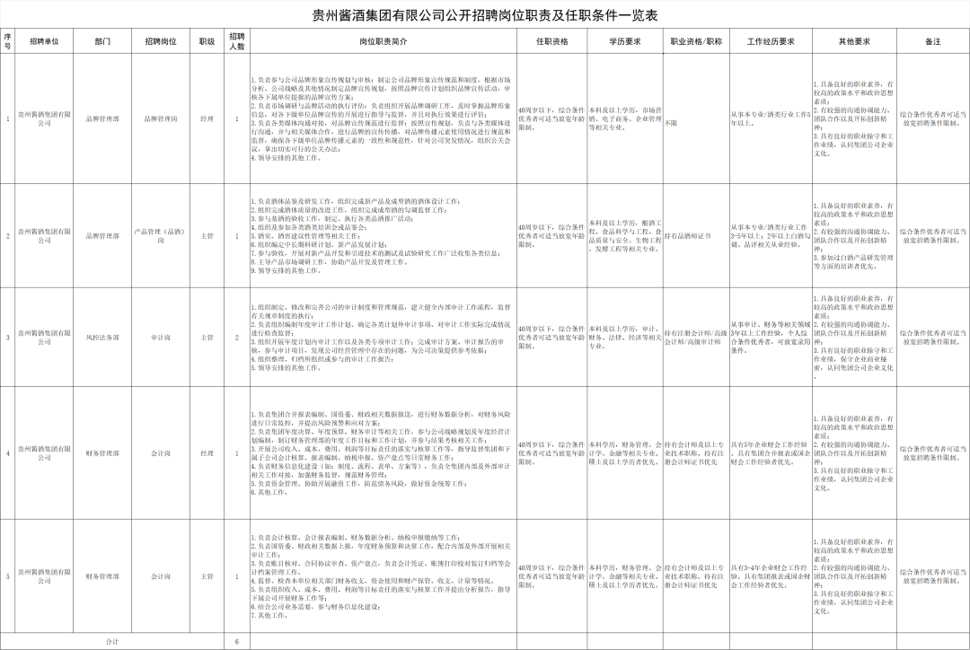 本次面向社会公开招聘6名工作人员,具体招聘岗位及要求详见附件《贵州酱酒集团有限公司公开招聘岗位职责及任职条件一览表》(见附件1)。任职条件计算年龄、工作年限、任职年限或取得专业技术职称时间计算日截止到本人报名时间。