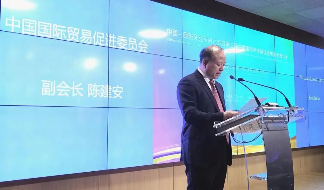 活动开幕式上,中国国际贸易促进委员会副会长陈建安首先登台致辞,代表中国国际贸易促进委员会、中国国际商会、中国国际展览中心,向与会嘉宾、企业家朋友、中西各界人士等表示热烈欢迎和诚挚谢意,并对近年来中国和西班牙在经贸领域的务实合作、友好交往中取得的成果给予充分肯定。