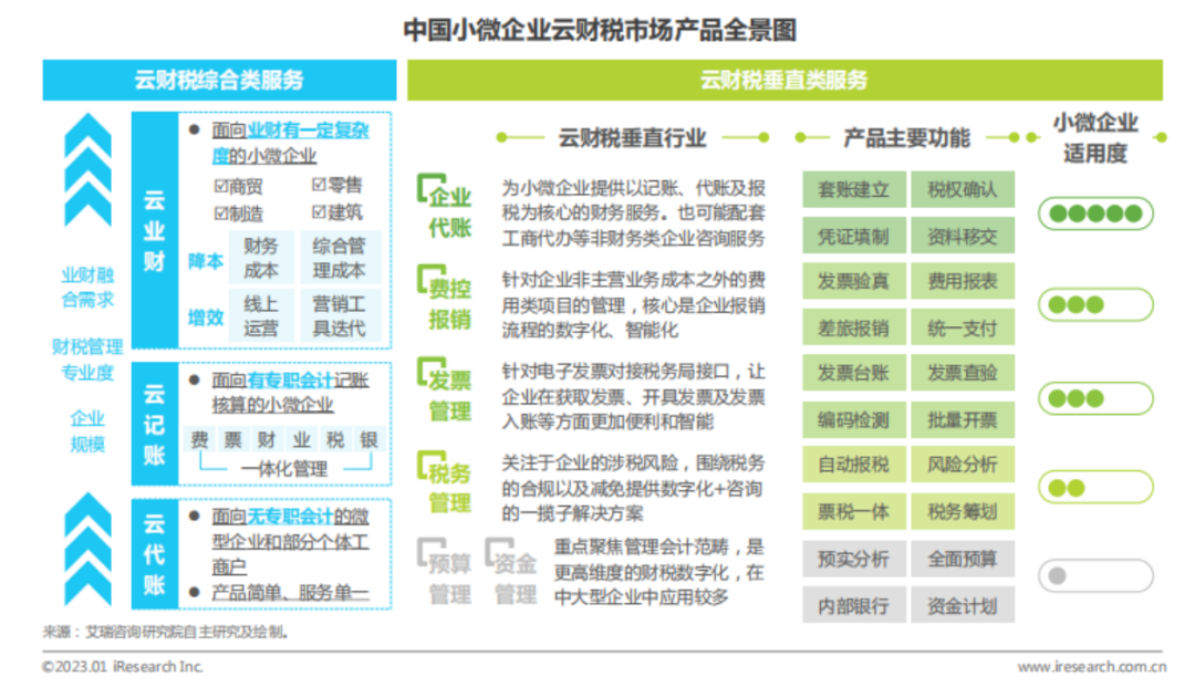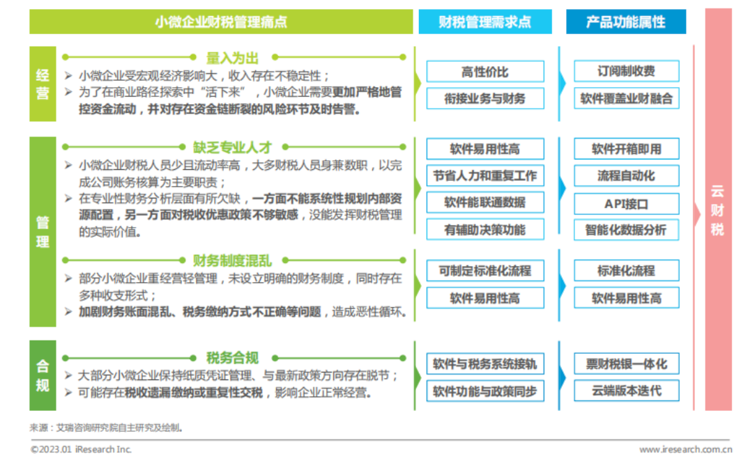 随着大数据、物联网、云计算、人工智能等技术的不断发展迭代,以及金税四期等政策的推动,小微企业面临着财税规范化和系统智能化的更高要求。提升企业业务韧性与抗风险能力、优化业财管理并实现业务降本与创收成为小微企业经营关注点和发力重点,同时小微企业对以业财融合为核心价值的云财税产品的需求不断提升。