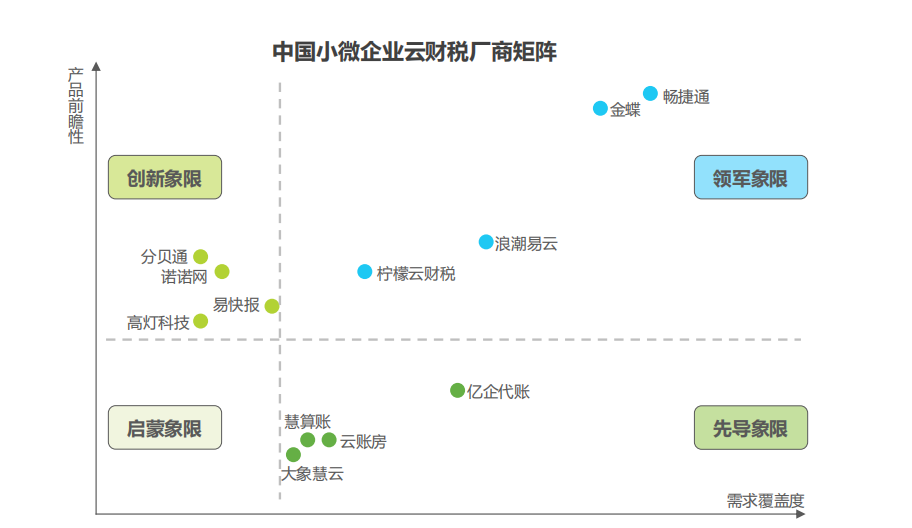 《报告》通过对公开资料和数据的搜集,与行业专家、财税专家的深度对话,以及自身行业研究积累,对行业空间规模及增速、头部厂商份额、厂商能力矩阵等核心指标综合研究得出成果:畅捷通依靠在产品前瞻性实现云原生产品行业全覆盖,并聚焦五新领域,全方位助力小微企业数智转型,问鼎小微企业云财税服务市场领军厂商。在产品前瞻性以及客户需求满意度上,均获得第一,登顶行厂商矩阵领军象限!
