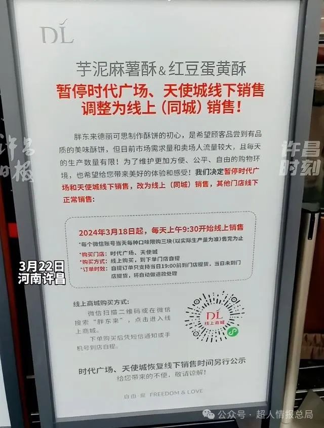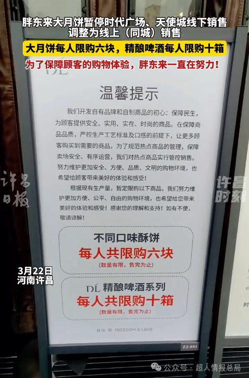 根据3月22日许昌时刻官方账号发布的视频内容,胖东来决定暂停在时代广场和天使城的线下销售大月饼,改为同城线上销售。这一变动的目的在于确保更多顾客能够购买到需要的商品,同时规范热门商品的管理,维护商场的安全和运营。据公告显示,他们将对热门商品进行限购,以保障购物环境的便利和公平。根据现有的生产量,暂定对热门商品实行限购措施。