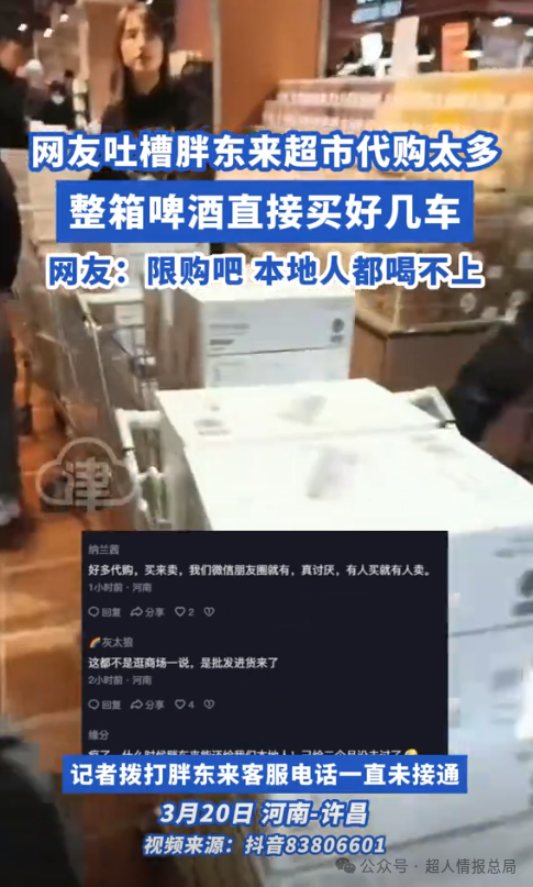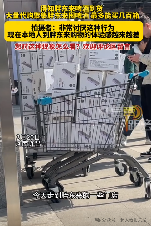 可是刚走到胖东来的门店就看到有大量的代购聚集在门口,一旁放置着大量购买的啤酒那场面把网友都吓住了。