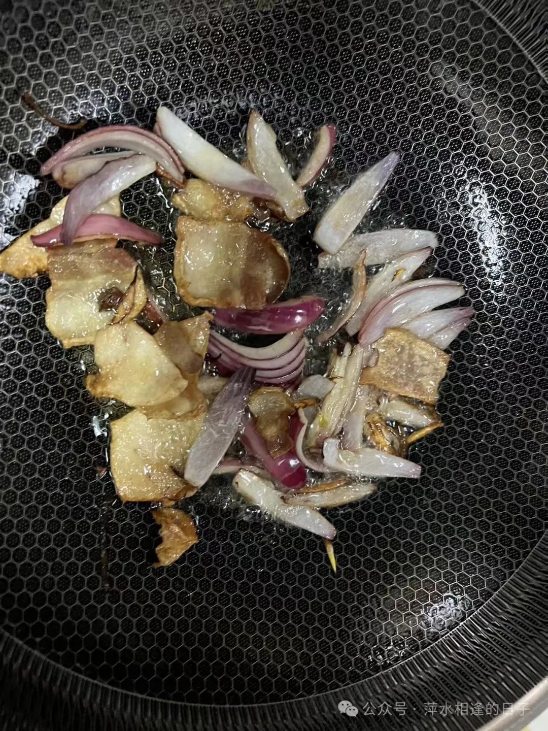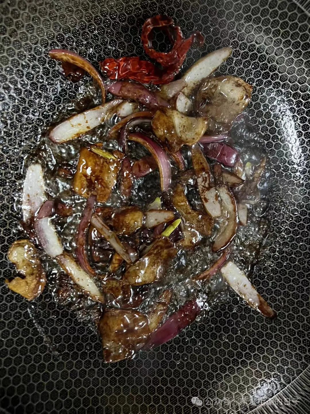 肥五花肉炒至出油,加八角1粒、半个洋葱、姜片少许、辣椒1个。