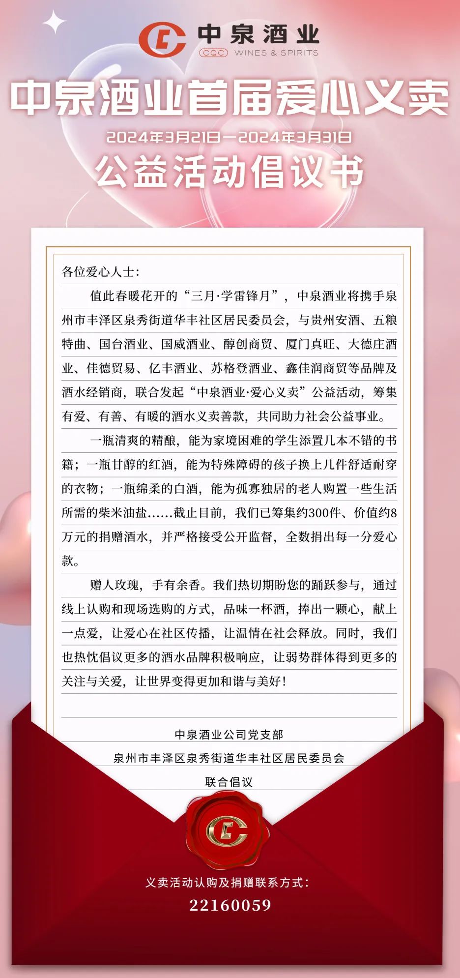 本次爱心义卖公益活动,是中泉酒业公司为践行国企担当、弘扬雷锋精神、推动社会和谐的系列举措之一,充分发挥国企平台作用,整合行业优势资源,联动酒水品牌方、酒水运营商,共同传递人文关怀,让慈善变成一股力量,用实际行动传播公益理念,传递社会温度。