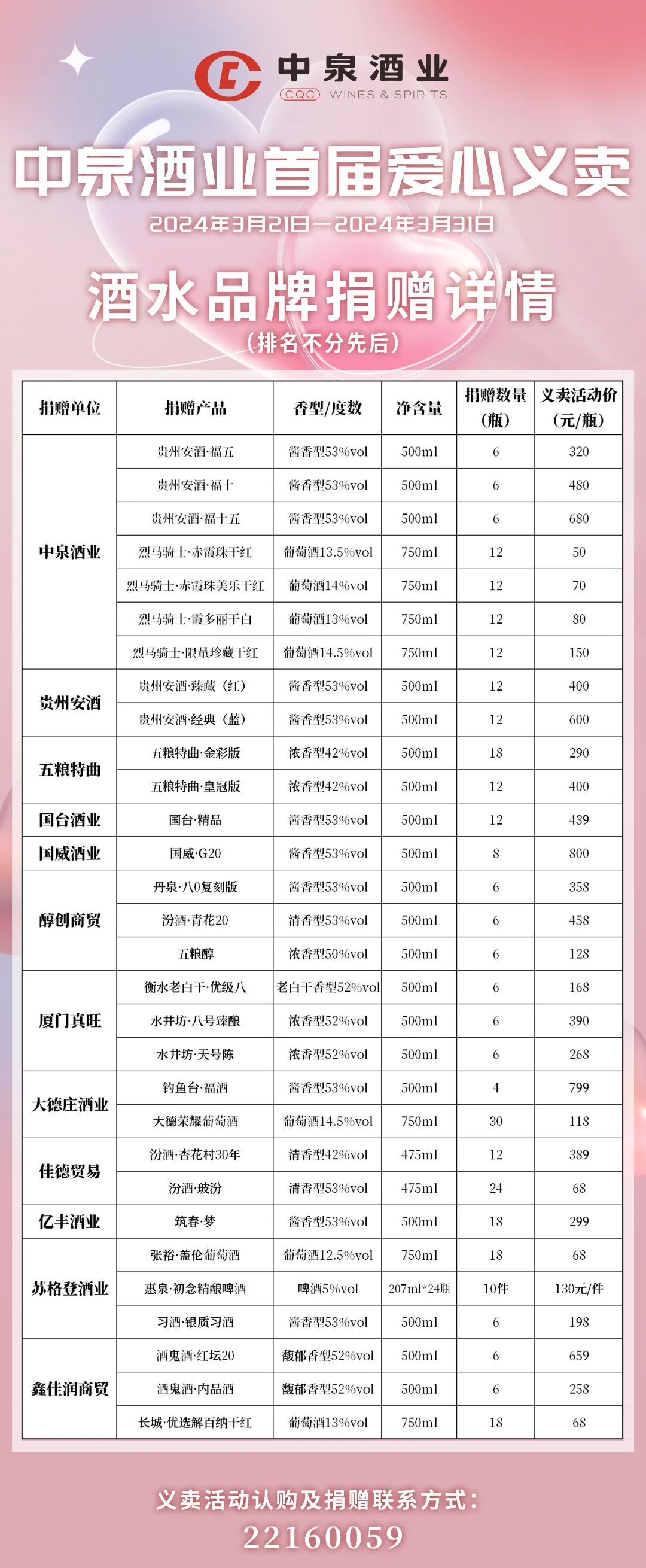 已报名参与本次义卖活动的协作单位包括:贵州安酒、五粮特曲、国台酒业、国威酒业、醇创商贸、厦门真旺、大德庄酒业、佳德贸易、亿丰酒业、苏格登酒业、鑫佳润商贸。