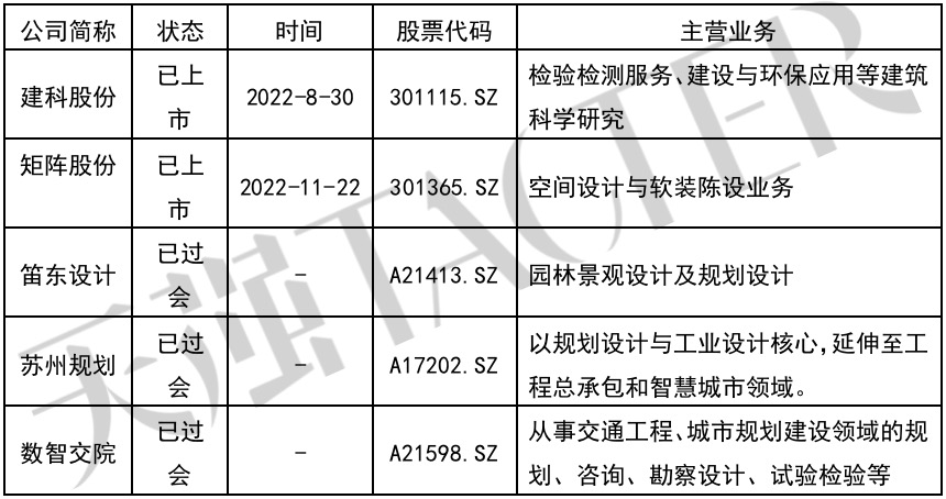 从2022年设计企业上市情况来看,与2021年相比,数量大幅减少,截止到2022年11月底,仅有5家企业成功过会,2021年为11家。这5家分别是常州市建筑科学研究院集团股份有限公司(简称“建科股份”)、矩阵纵横设计股份有限公司(简称“矩阵股份”)、浙江数智交院科技股份有限公司(简称“数智交院”)、苏州规划设计研究院股份有限公司(简称“苏州规划”)和笛东规划设计(北京)股份有限公司(简称“笛东设计”)。