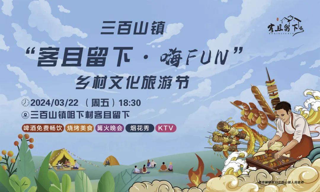 为贯彻落实县委、县政府“融入湾区发展,精雕东江翡翠”目标任务,推动三百山镇旅游高质量发展,今年年初,三百山镇党委、政府就已决定将今年定为“旅游要素攻坚年”,并成立了领导小组,制定了实施方案。作为“旅游要素攻坚年”的活动之一,3月22日,在咀下村客且留下民宿成功举办了“客且留下·嗨FUN”乡村文化旅游节活动,让我们一起来看看吧!