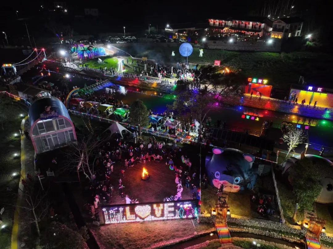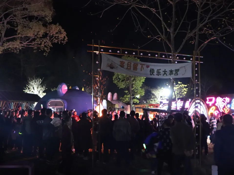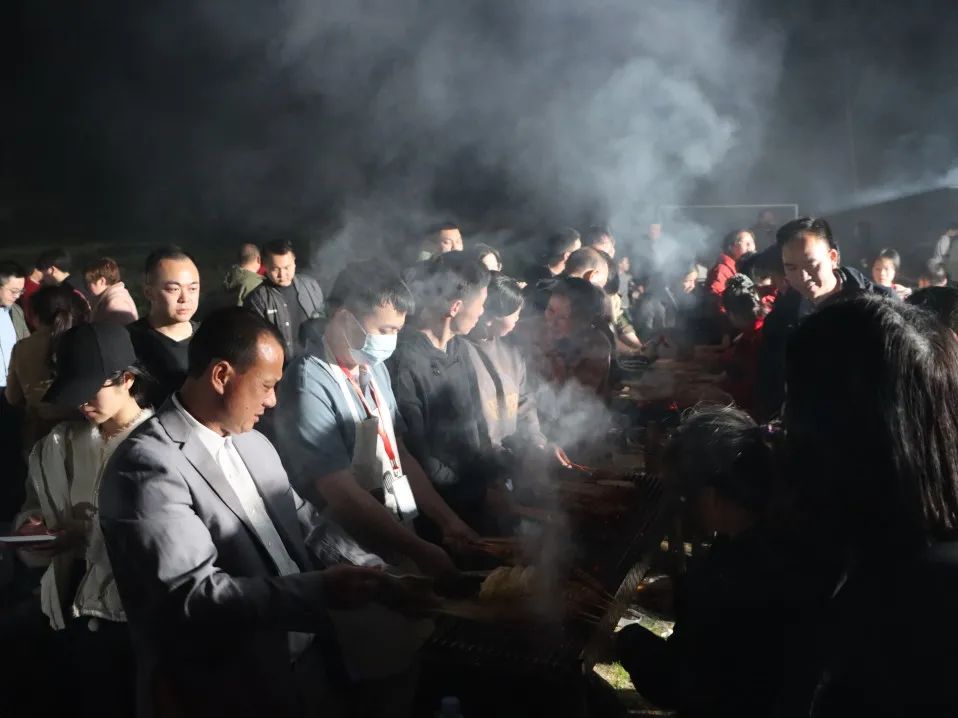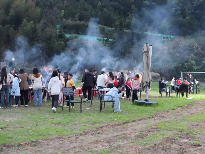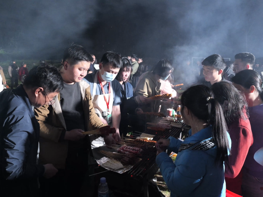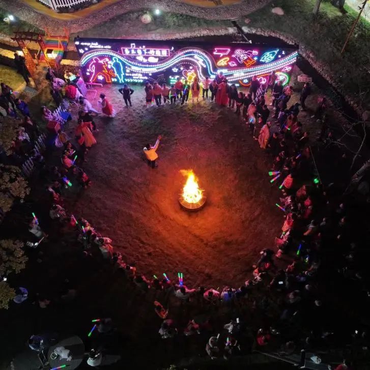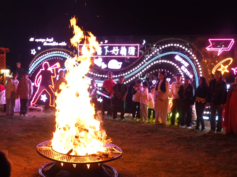在篝火旁,大家积极参与水果蹲、兔子舞、桃花朵朵开、听歌猜歌名等趣味小游戏,手拉手跳圆圈舞,处处洋溢着幸福的笑声。