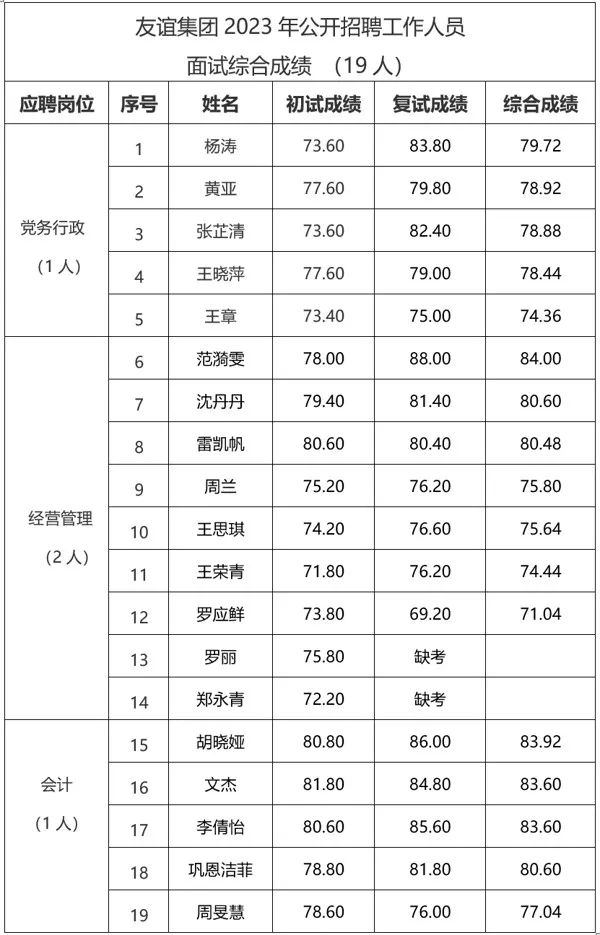 成绩公示 | 贵阳友谊(集团)股份有限公司2023年公开招聘工作人员面试综合成绩公示
