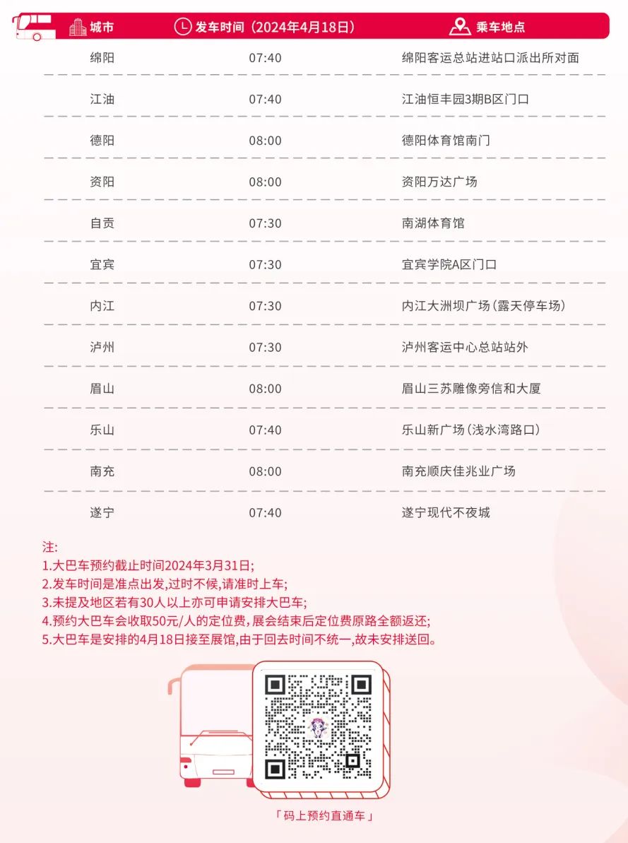 *特别说明:大巴车仅4月18日上午接至展馆,不安排送回,请提前规划行程。